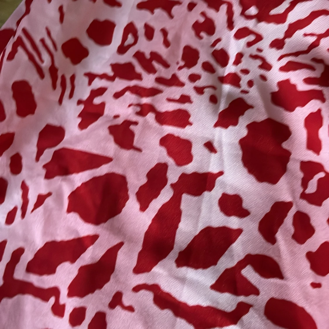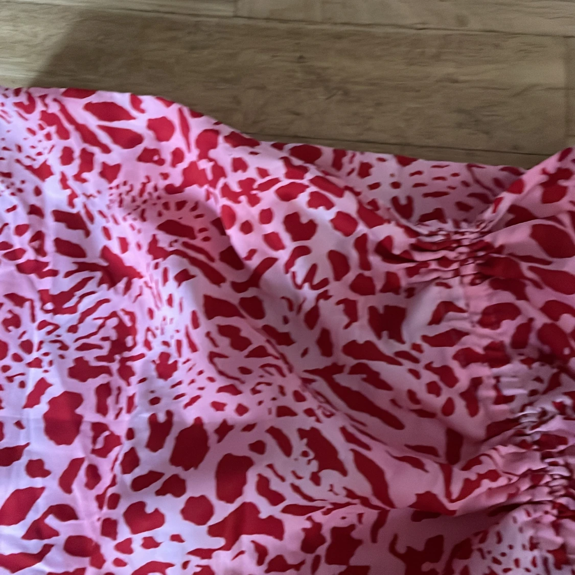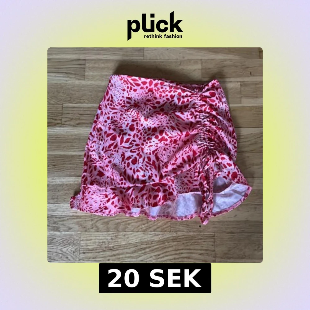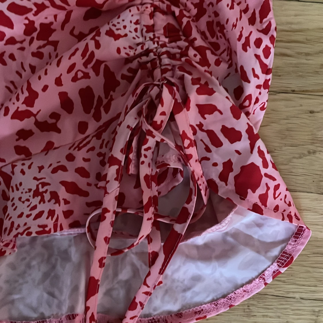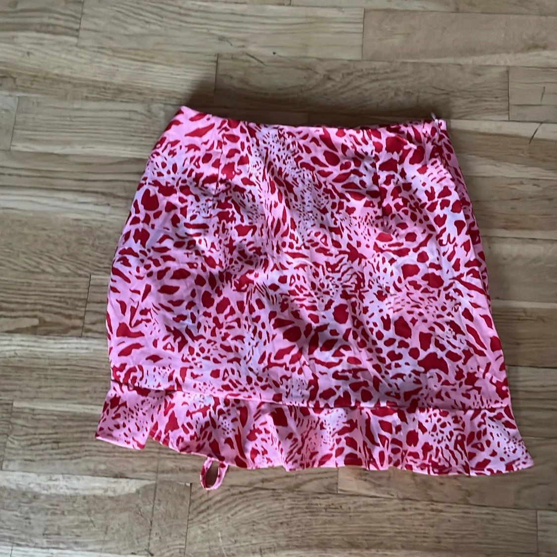 Säljer en snygg kortkjol i rosa och rött med ett djärvt leopardmönster. Kjolen har en volangdetalj längst ner och snörning på sidan för en justerbar passform. Perfekt för att sticka ut med stil!