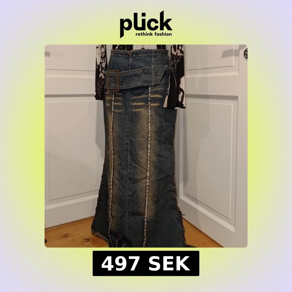 Unik lång jeanskjol i blå denim med slitna detaljer, råa kanter och markerade sömmar. Kjolen har ett brett denim-bälte med stor spänne och snörning längs sidorna. Dragkedja bak och coola slitningar framtill.