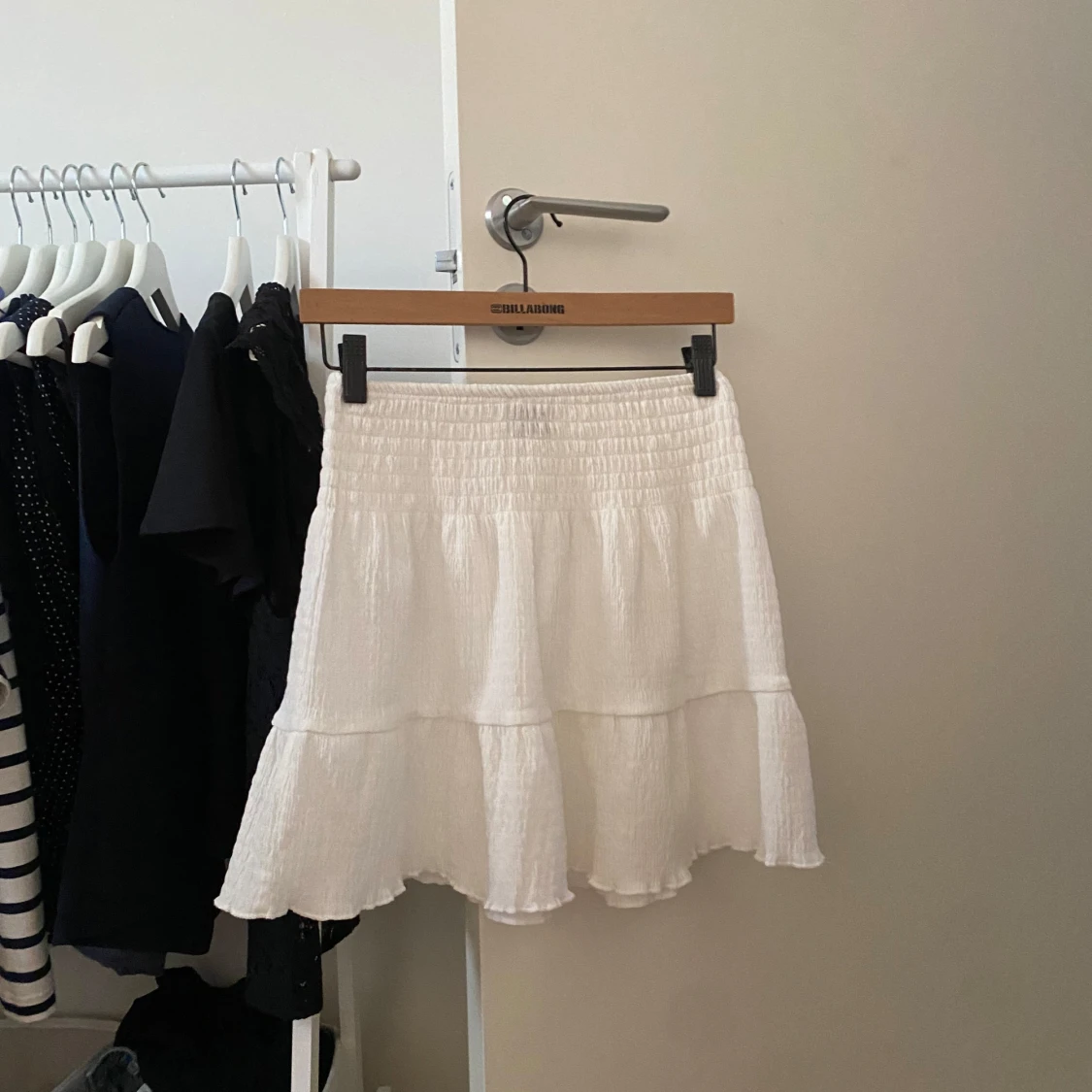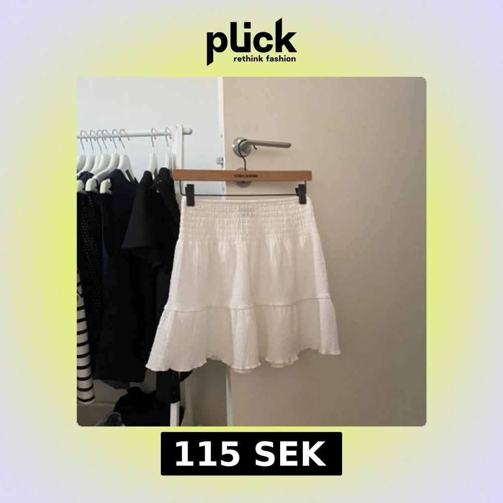 Superfin vit kortkjol med volanger och smockad resår i midjan. Kjolen är luftig och har en lätt struktur i tyget, perfekt för varma dagar. Enkel att matcha med både toppar och sneakers för en chill look.