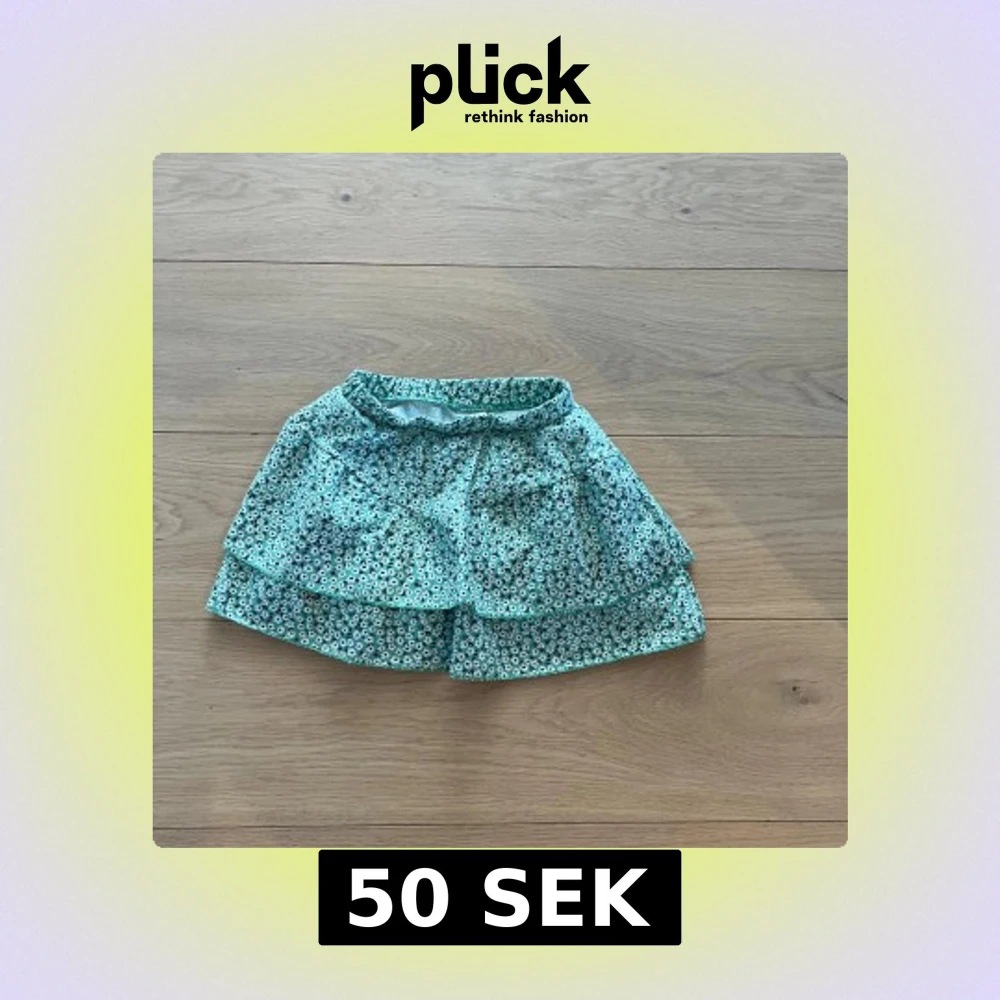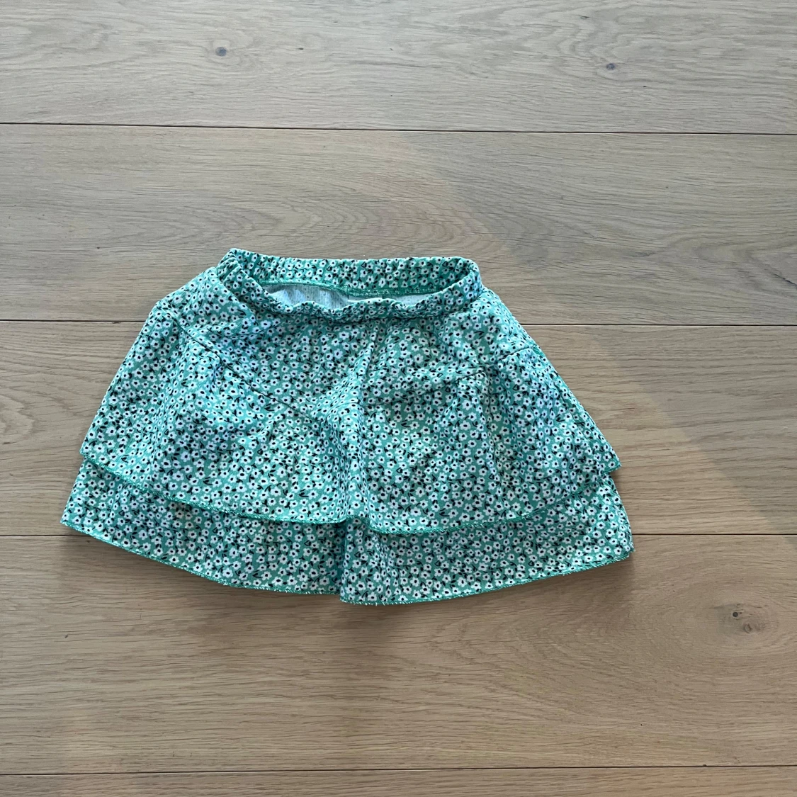 Söt kortkjol i grönt med ett blommigt mönster. Kjolen har volanger som ger en lekfull look. Perfekt för varma dagar! Shorts under.
