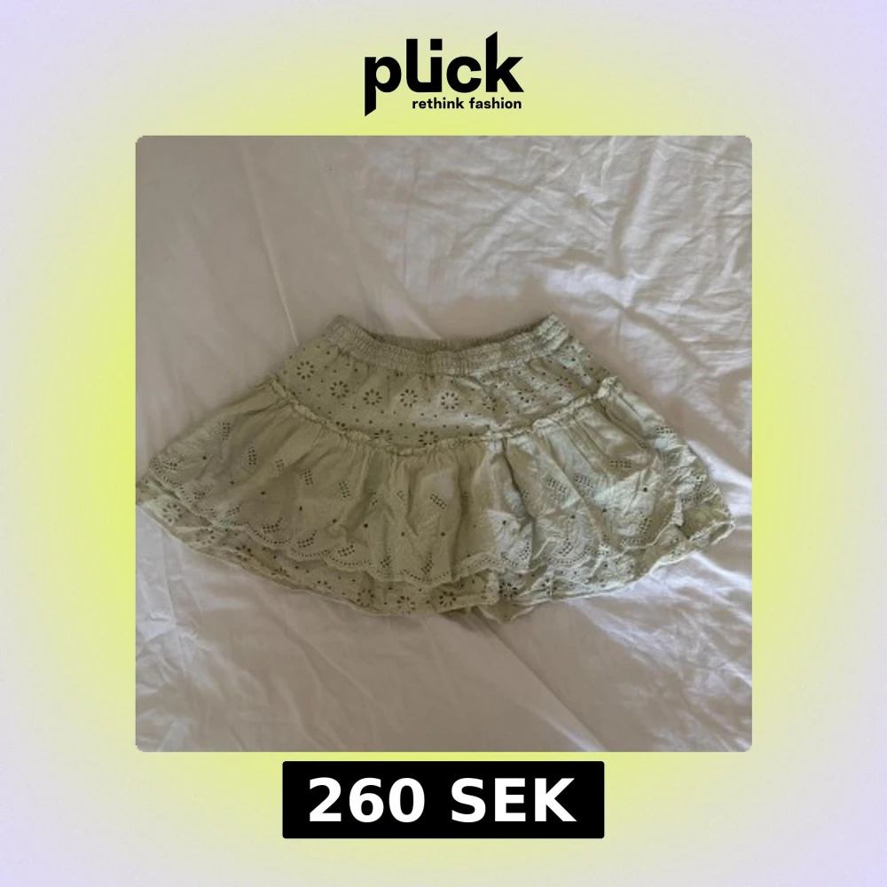 Supersöt ljusgrön kortkjol från Zara med broderade blommor och volangkant. Kjolen har resår i midjan och är gjord i mjuk bomull, perfekt för dig som gillar romantisk och chill stil. Passar dig som vill ha något extra gulligt i garderoben. Kjolen har shorts under
