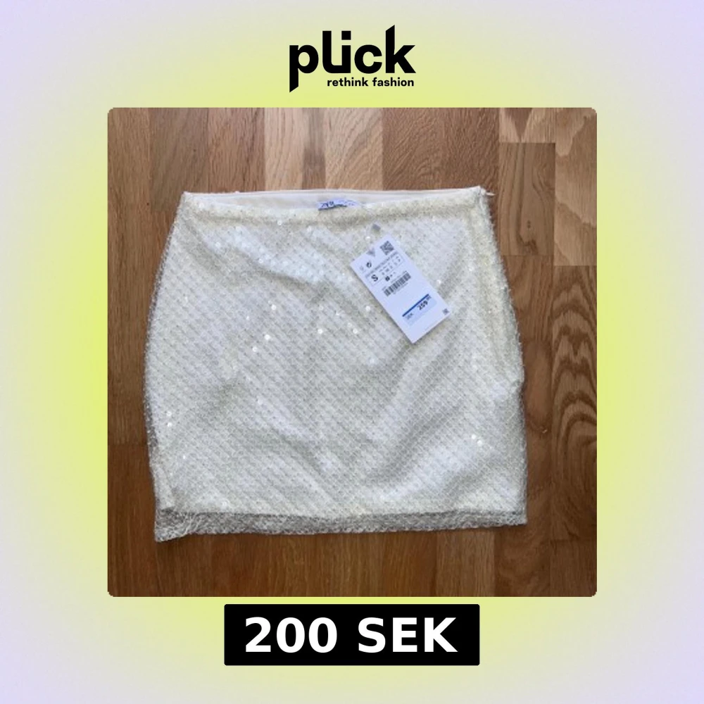 Säljer en vit kortkjol från Zara med glittrande paljetter och diskret rutmönster. Kjolen har en rak passform och dragkedja i sidan. Är ny och helt oanvänd. Lappen kvar därmed priset!