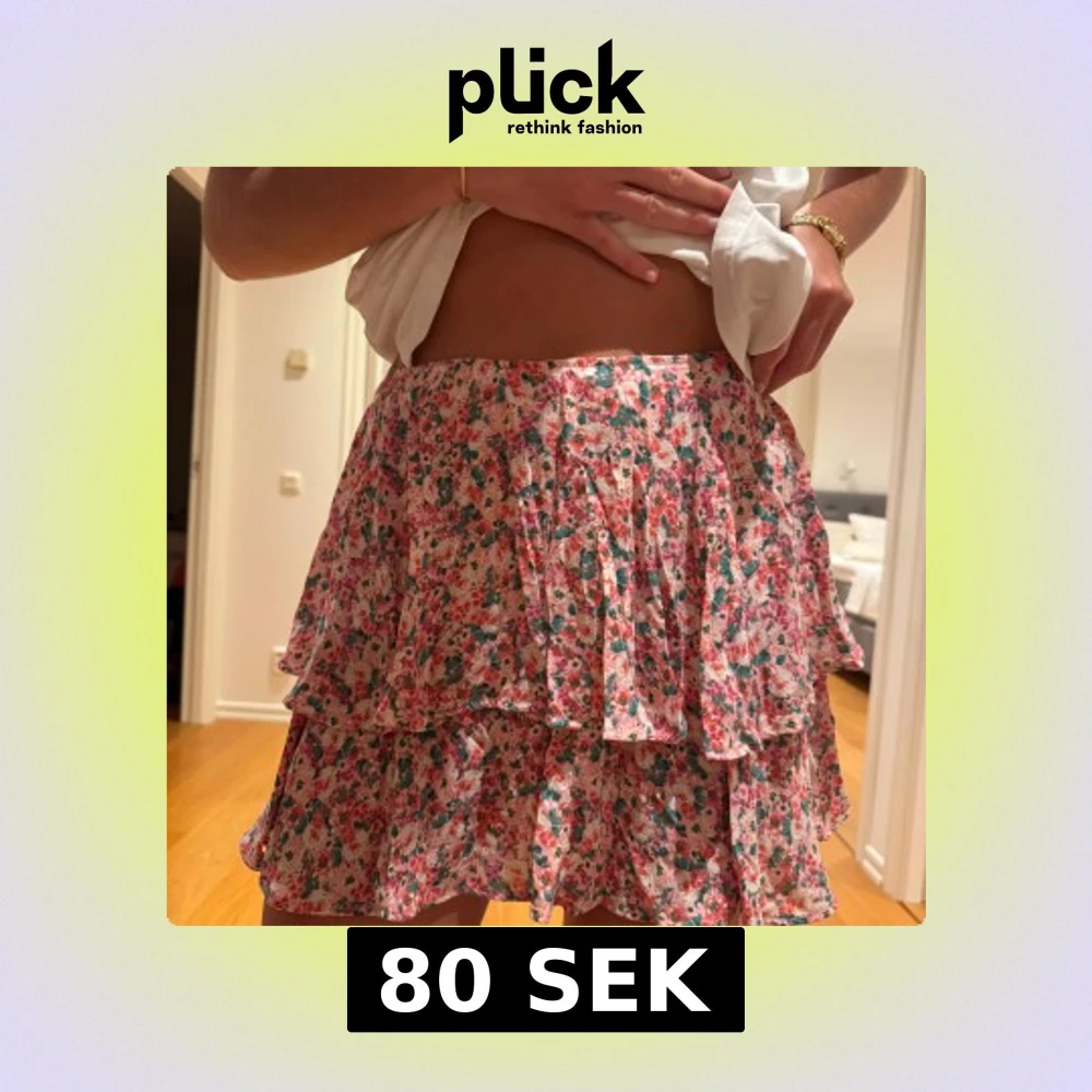 Supersöt kort volangkjol från Zara med blommigt mönster i rosa, grönt och vitt. Kjolen har flera lager volanger som ger en flowy känsla och är perfekt för varma dagar.