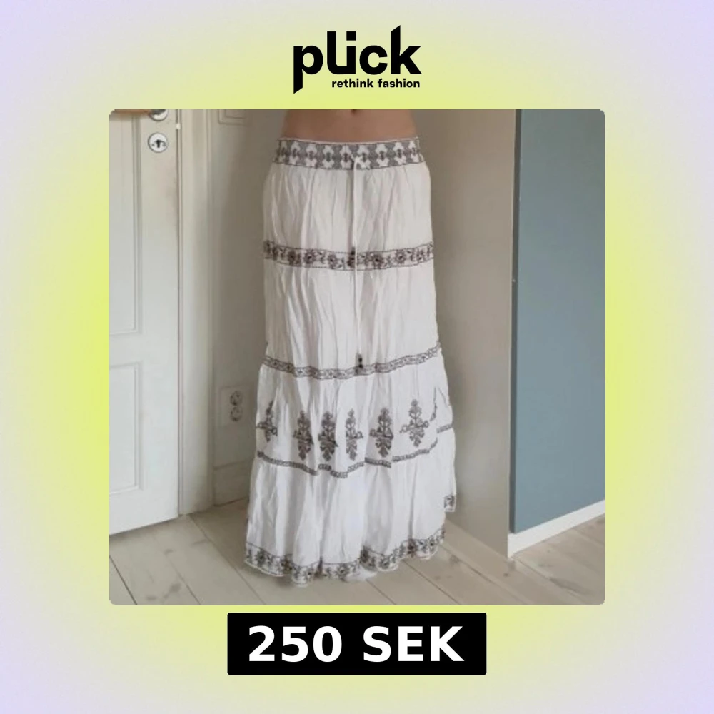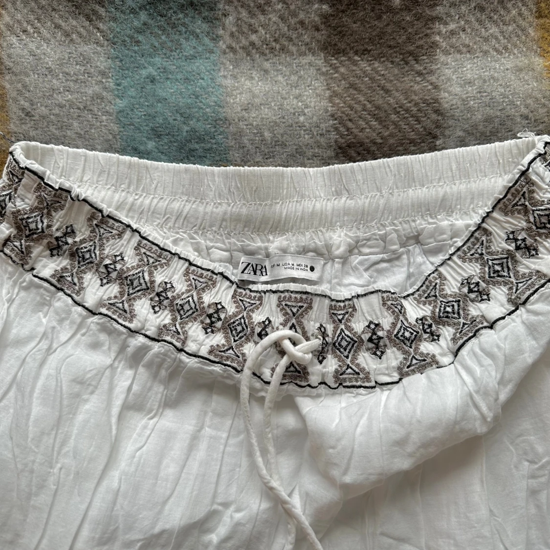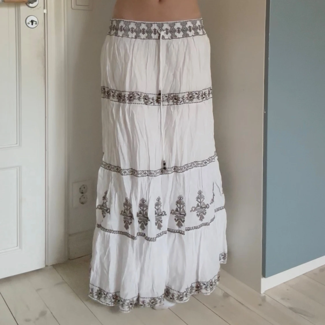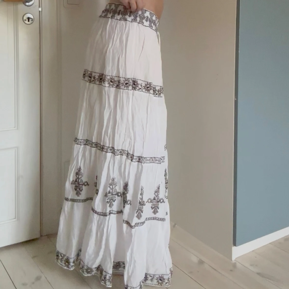 Supersnygg vit långkjol från Zara med broderade detaljer i svart och beige. Kjolen har resår och snörning i midjan, samt flera broderade band och mönster längs kjolen. Kjolen är 94 cm lång och midjemåttet mätt rakt över är 40 cm. Dock är det resor upptill, alltså passar den om man har ännu bredare höfter!