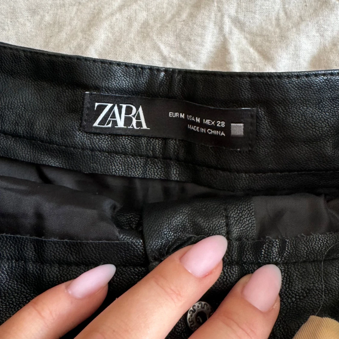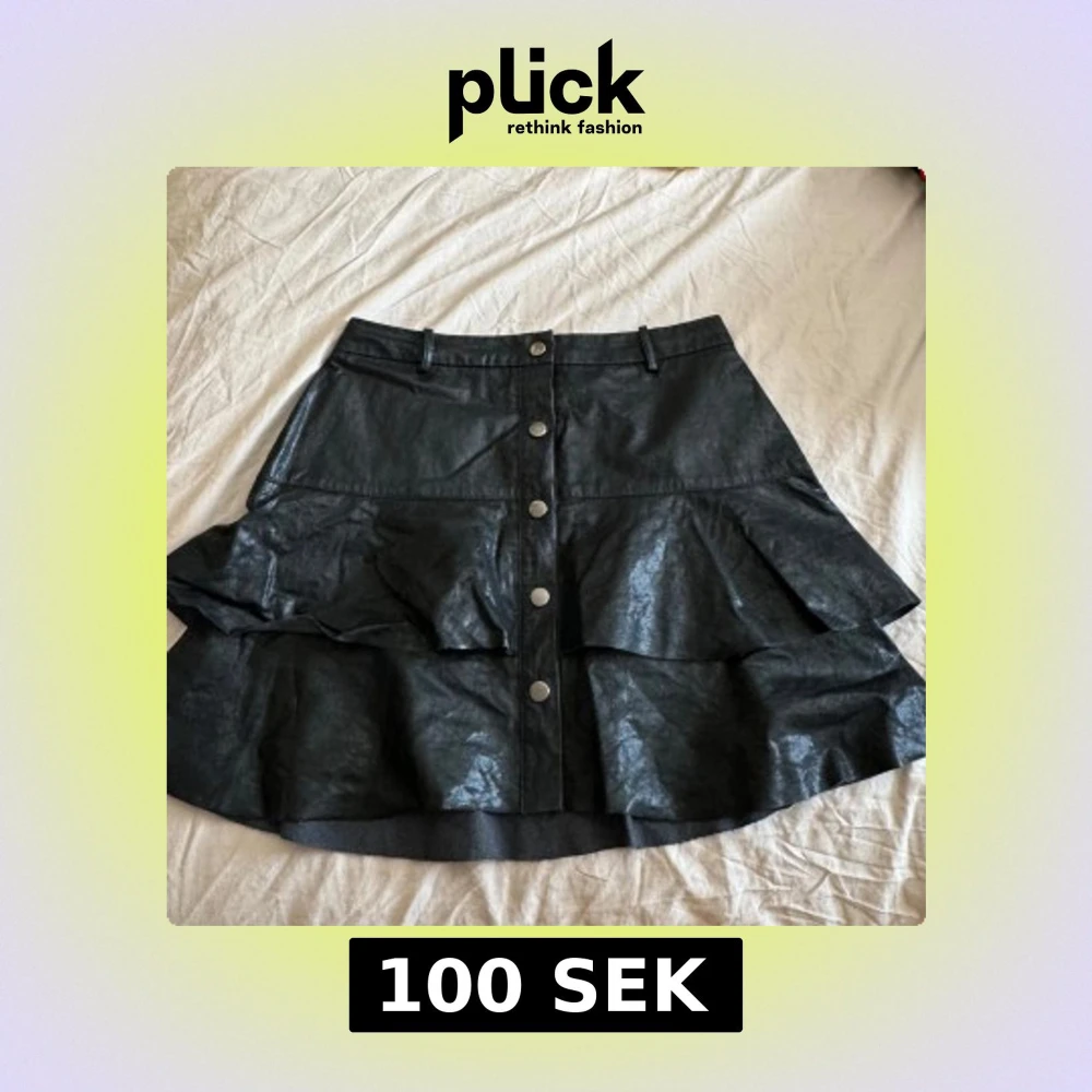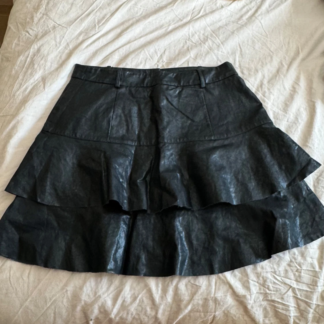 Supersnygg svart kortkjol från Zara i skinnimitation med volanger och knappar framtill. Kjolen har bälteshällor och en cool, lite glansig finish. Perfekt för dig som vill sticka ut med en edgy vibe. Tyvärr för liten för mig