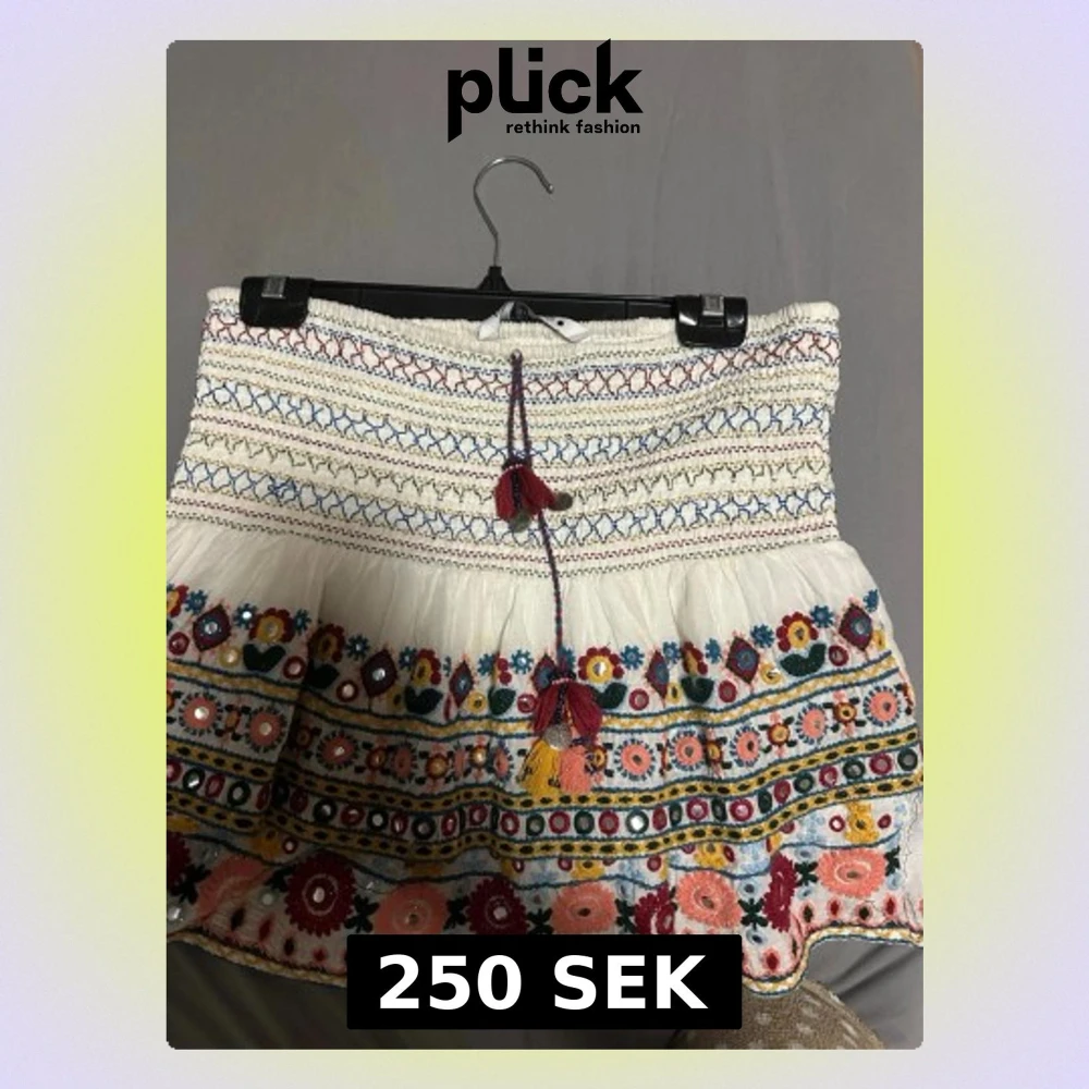 Säljer en vit kortkjol med färgglada broderier och blommönster i rött, blått, gult och grönt. Kjolen har smock upptill, dekorativa tofsar och volangkant. Materialet känns som bomull och kjolen har en bohemisk vibe med detaljerade sömmar och spegelbroderier. Snören sticker ut och har släppt