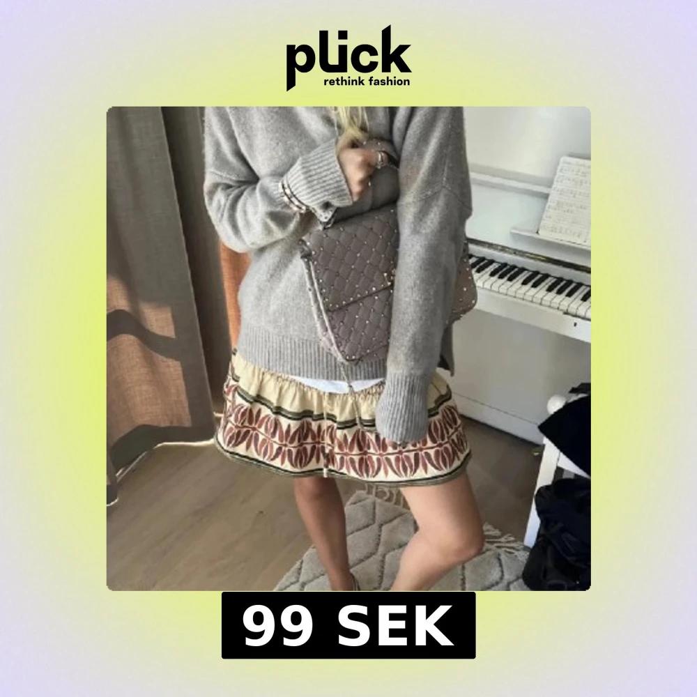 Supersöt minikjol från Zara i beige bomull med elastisk midja och snörning med pärlor. Kjolen har ett unikt rödbrunt och grönt mönster längs kanten och smockad överdel. Perfekt för dig som gillar boho-vibes och vill sticka ut lite extra. Stockholmstil. I 100% bomull och i nyskick.