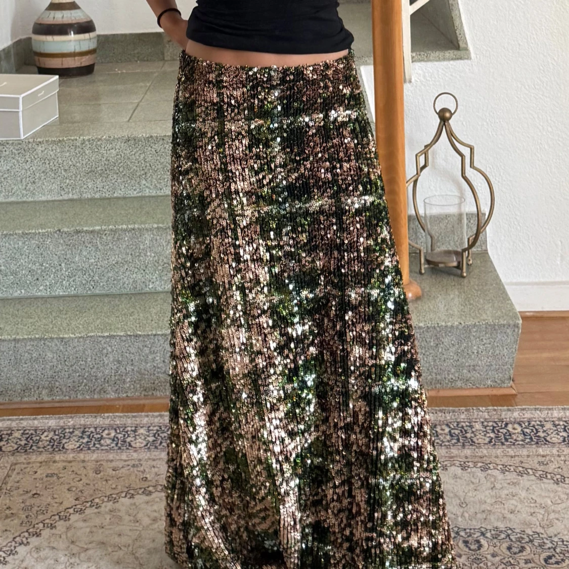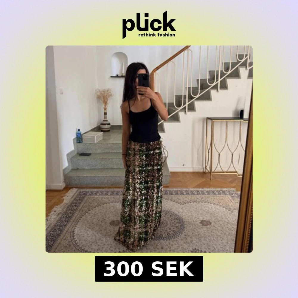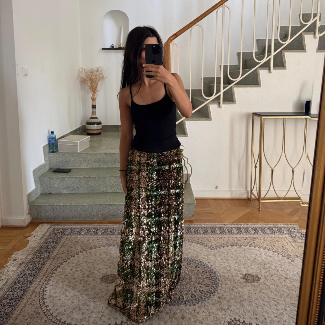 Säljer en maxilång paljettkjol från Zara i storlek S. Midi för dig som är 160 och över . Maxi för sig som är kortare än 160. Kjolen har ett rutigt mönster i guld, grönt och svart med massor av glittrande paljetter.