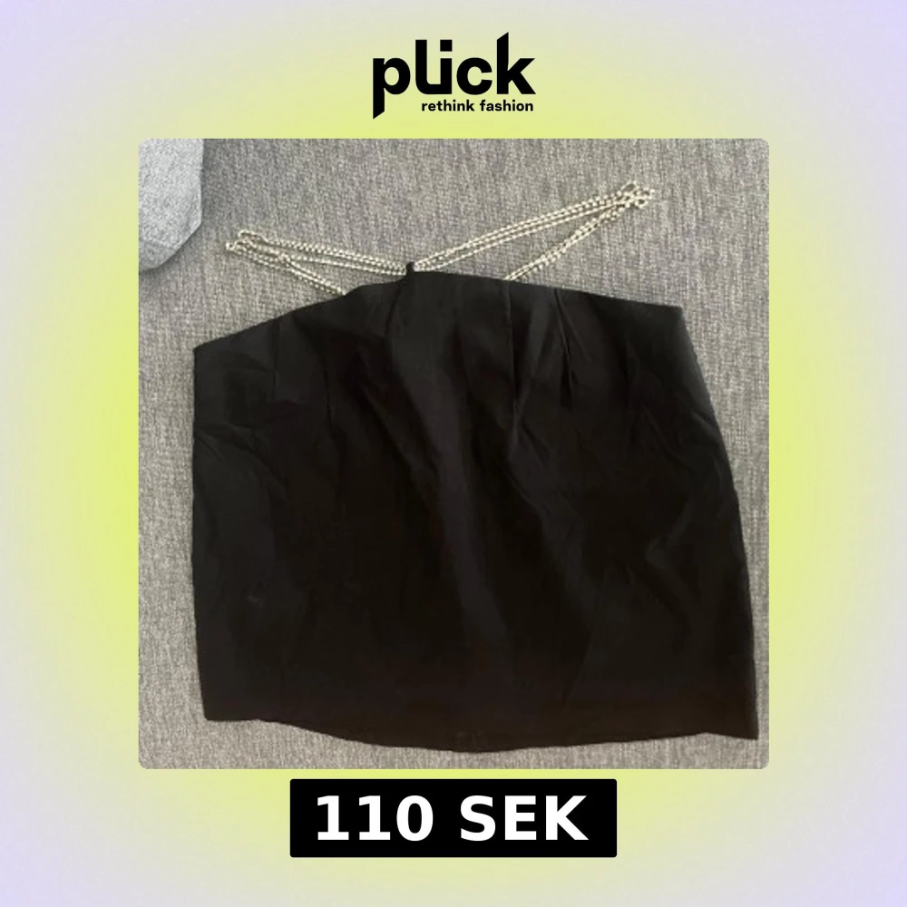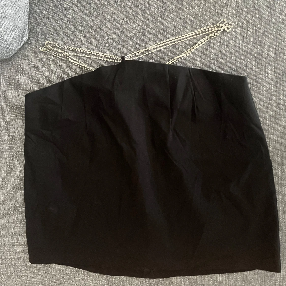 Super snygg fest kjol som tyvärr aldrig kommit till användning. Kjolen är högre i mitten av magen och svanken än vid höfterna. Över höfterna går strass band