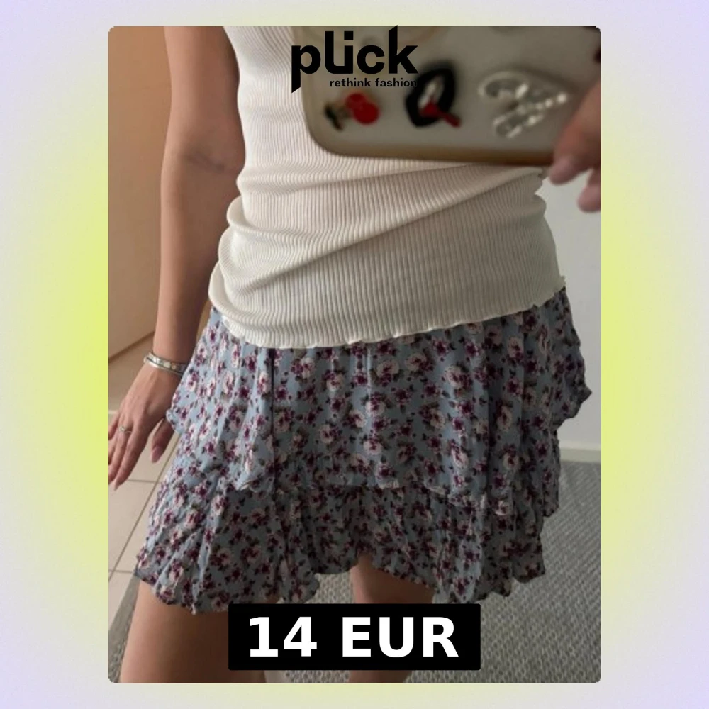 Supersöt kort kjol med volanger i ljusblått tyg och små blommor i lila. Kjolen har en luftig och flowy passform, perfekt för varma dagar.🪻🩵Köpt på zara.
