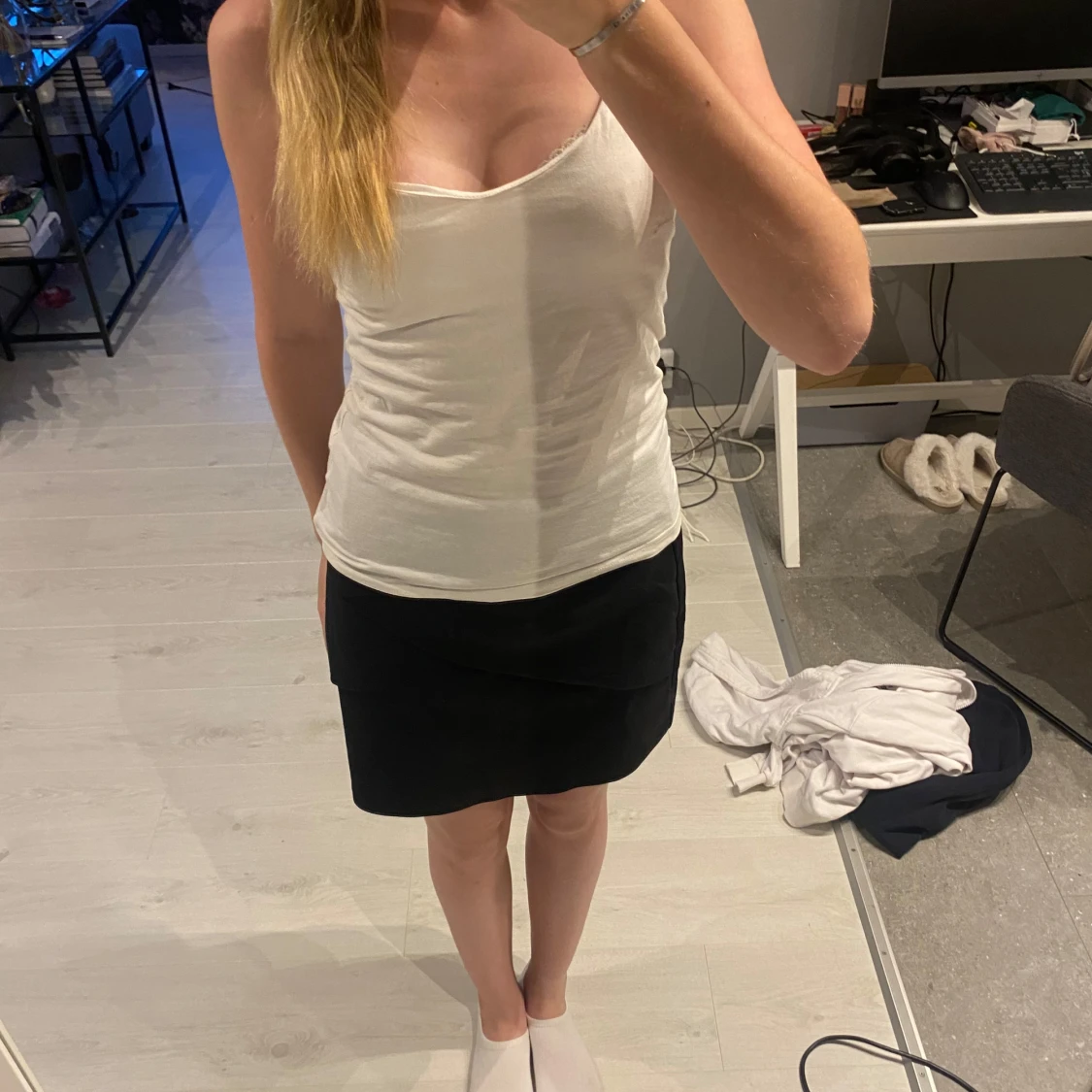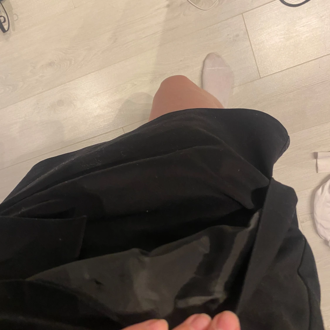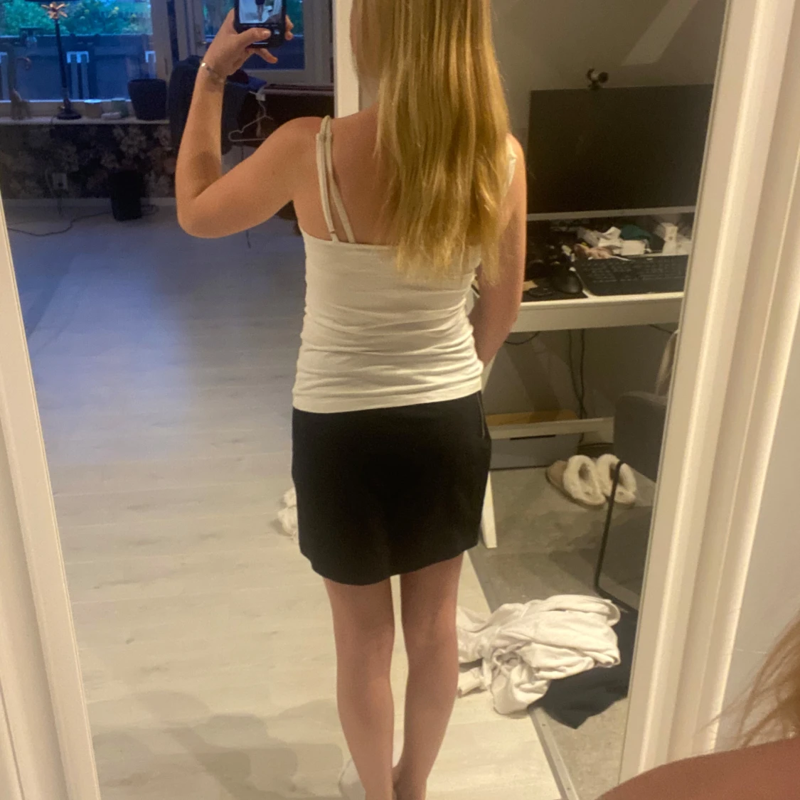 Enkel svart kortkjol med rak passform. Kjolen är helfärgad med volanger vilket inte syns så bra på bild. Säljer då den är lite för stor på mig.