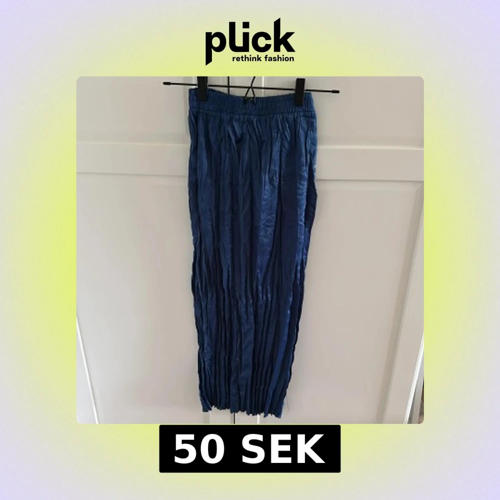 Säljer marinblå plisserade kjol från Zara med resår i midjan. Kjolen är tillverkade i ett glansigt syntetmaterial. Perfekta för dig som vill ha en bekväm och trendig look. Produkt mått: Midja; 25cm, längd; 84,5cm