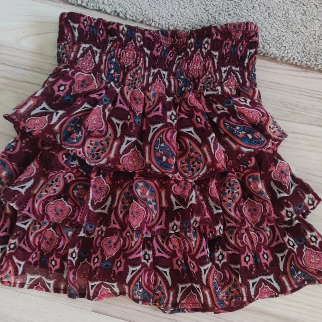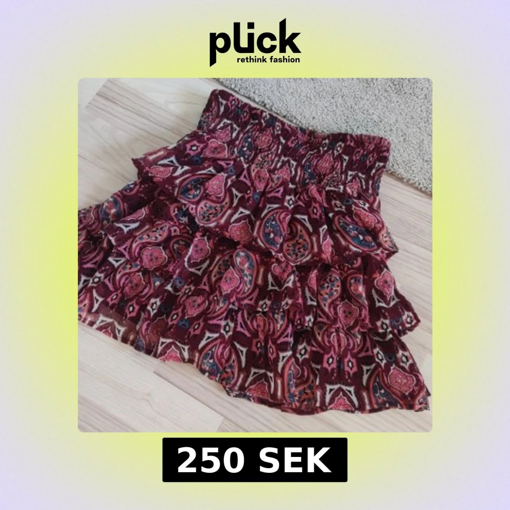 Säljer en färgglad kortkjol med ett livligt mönster i rött, rosa och blått. Kjolen har flera lager av volanger och en elastisk midja för bekväm passform. 💗