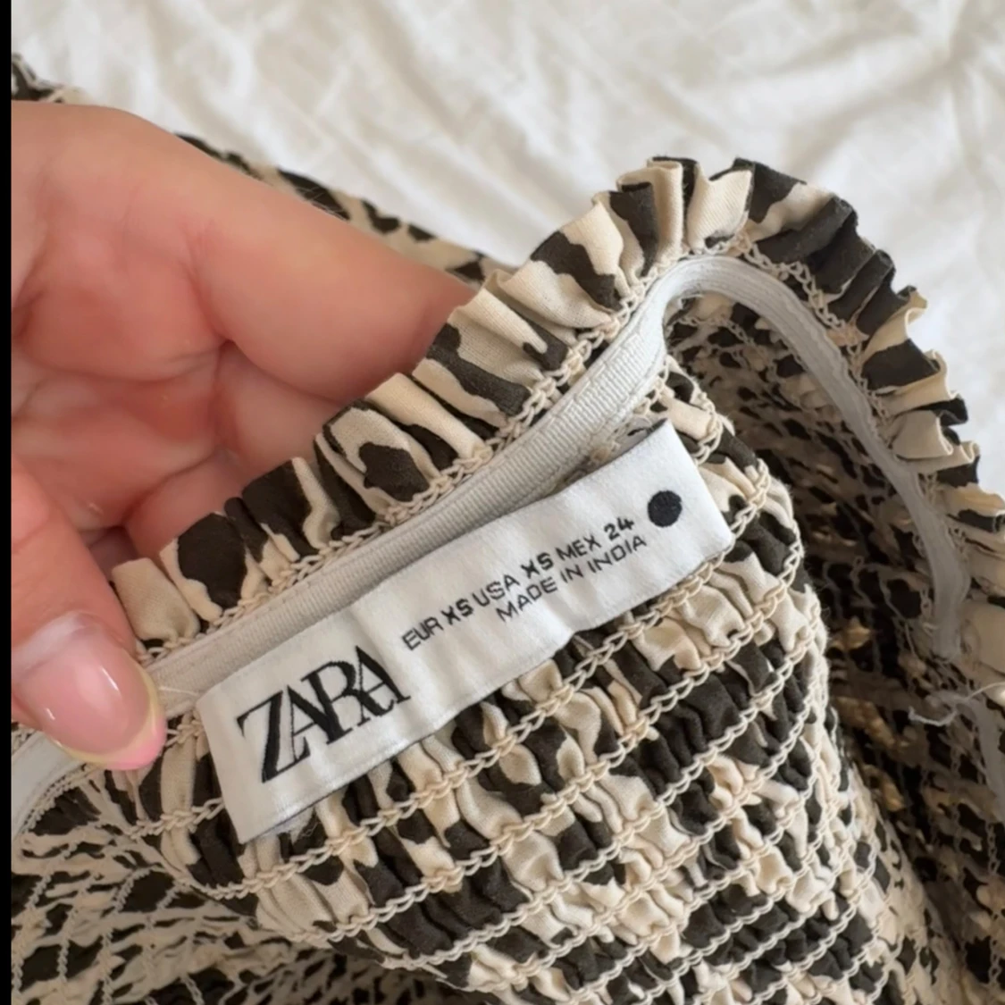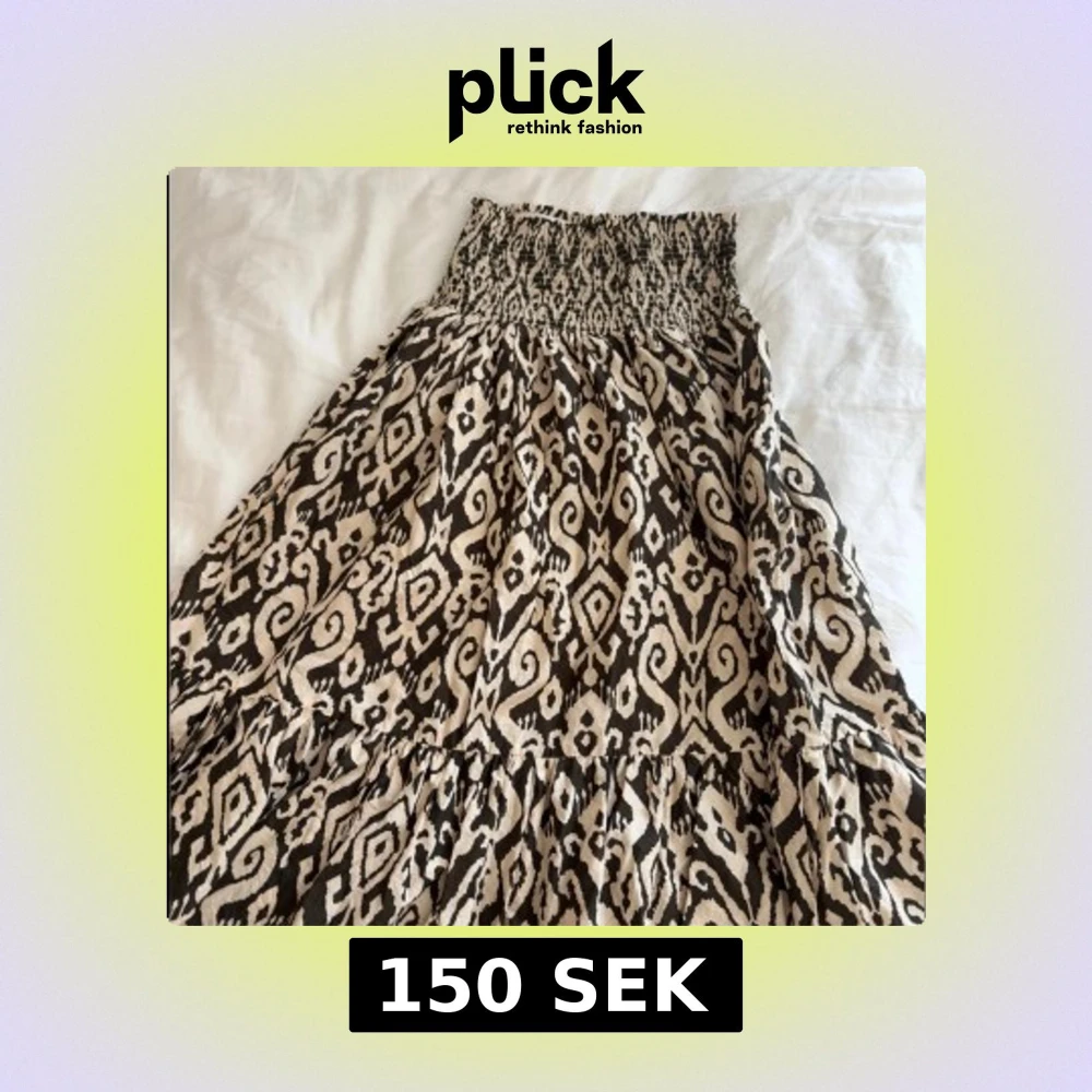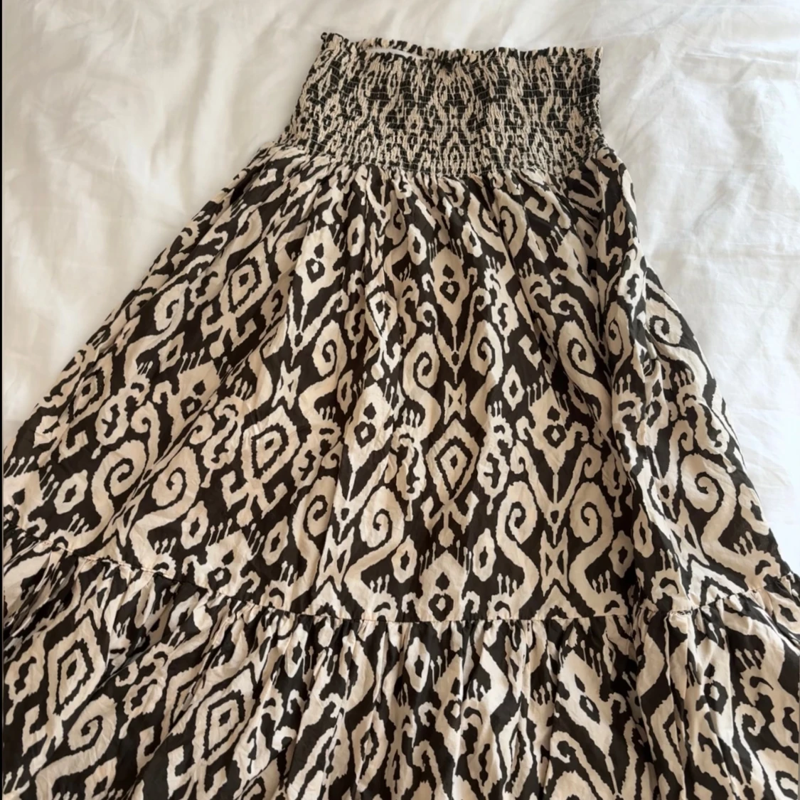 Supersnygg långkjol från Zara i beige och svart med ett unikt grafiskt mönster. Kjolen har smock upptill och faller snyggt i flera volanger. Perfekt för dig som gillar boho-vibbar och vill sticka ut med coola detaljer.