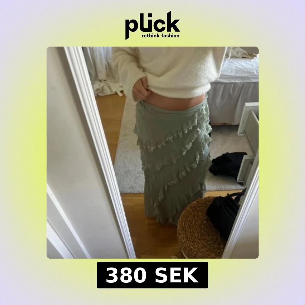 Säljer en långkjol i ljusgrön färg med flera lager volanger som ger en romantisk och flowy känsla. Kjolen har en mjuk och lätt struktur, perfekt för dig som gillar en feminin och trendig stil.