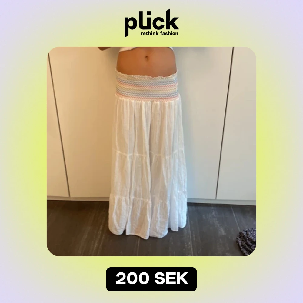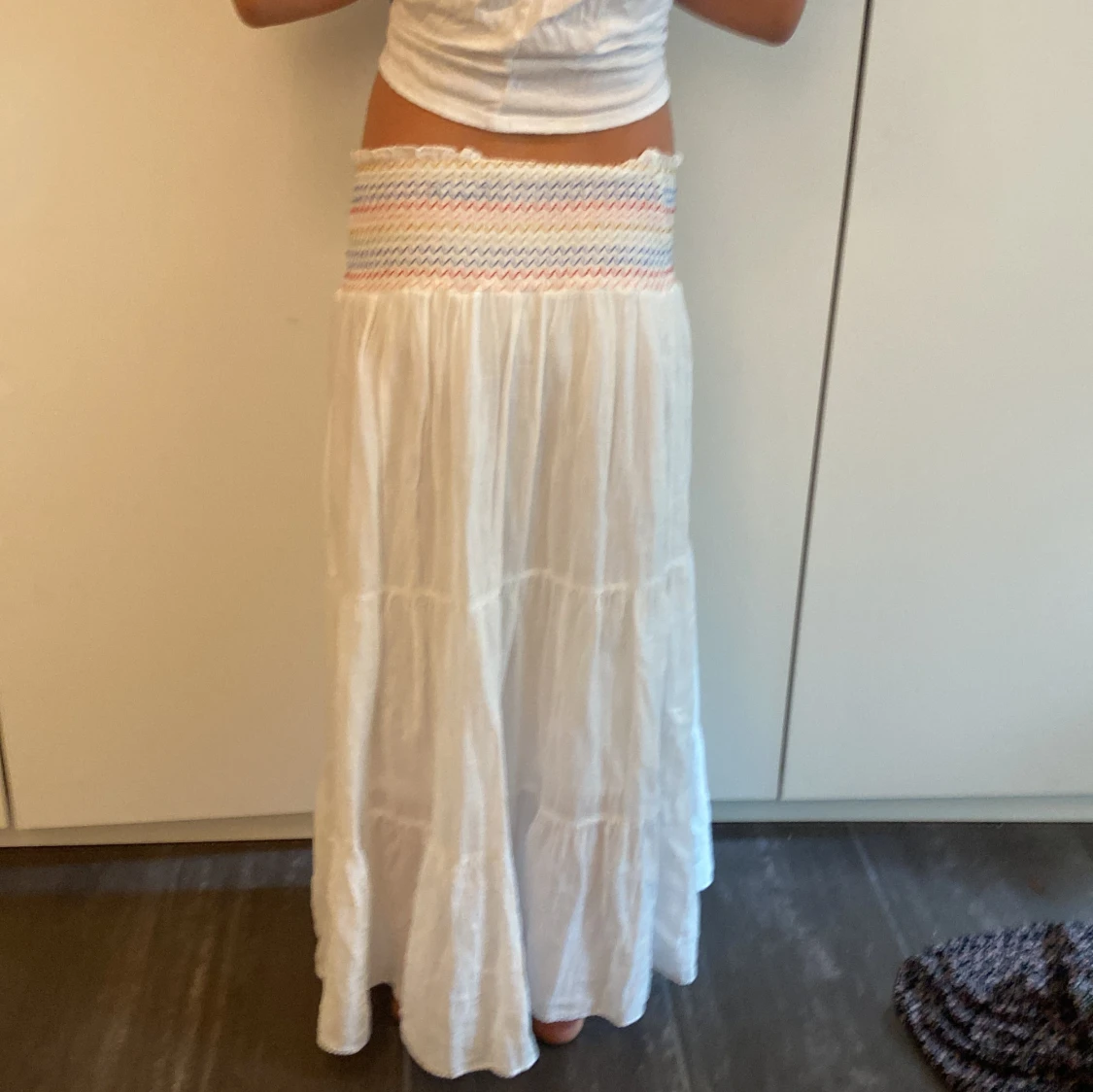 Säljer en superfin vit långkjol med en färgglad, mönstrad midja. Nästan helt oanvänd och inga defekter!💞💞