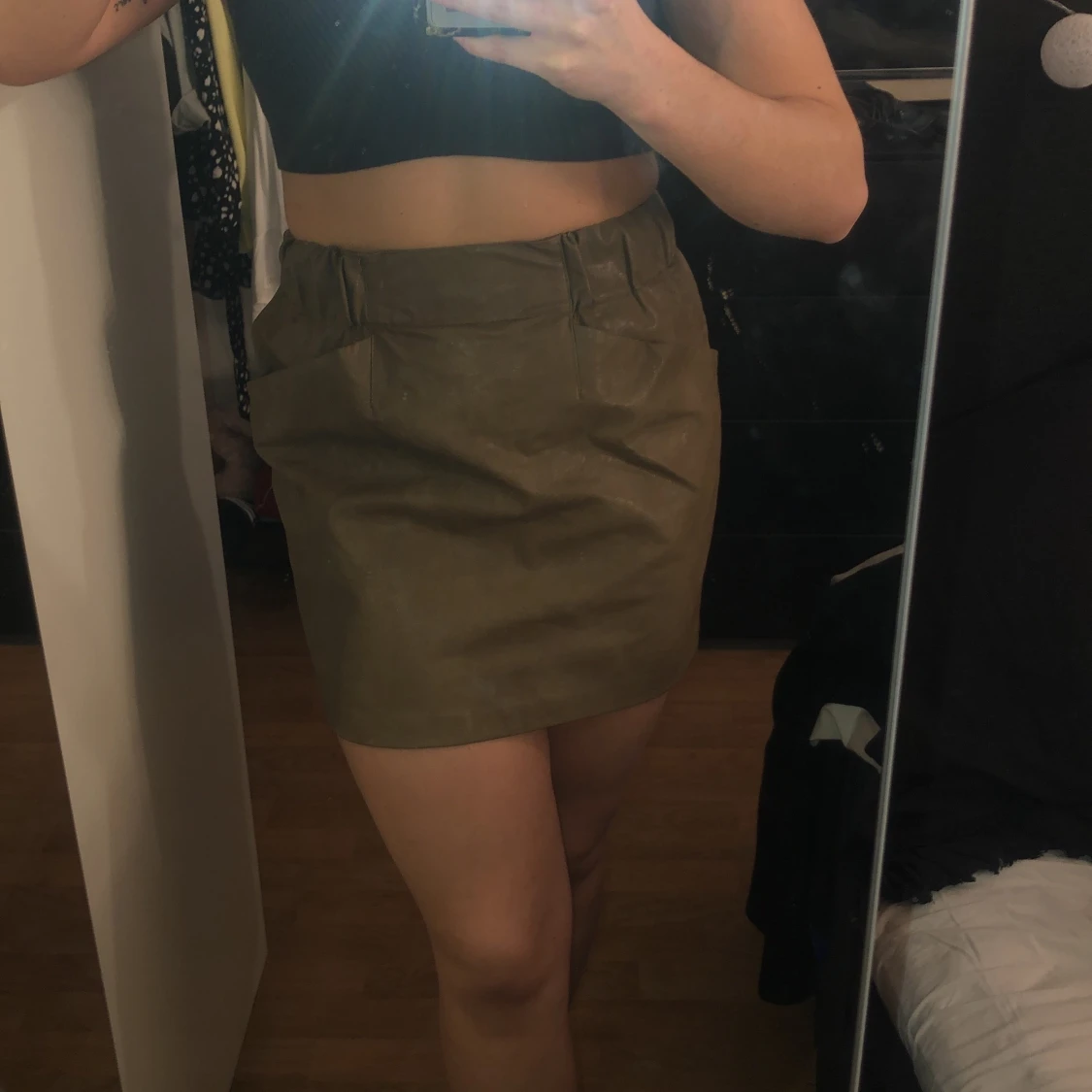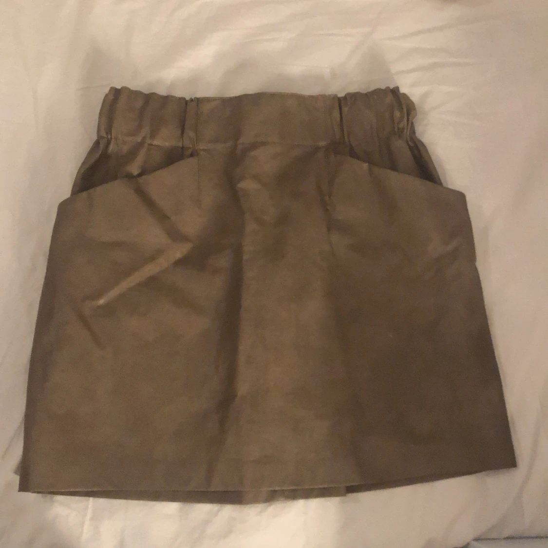 Skitsnygg brun skinnkjol/läderkjol (imitation) från Zara i storlek S med fickor framtill. Använd 1 gång.
