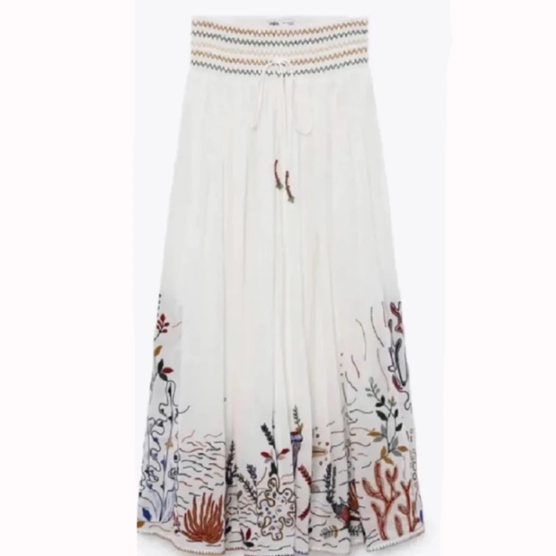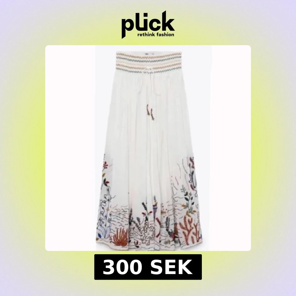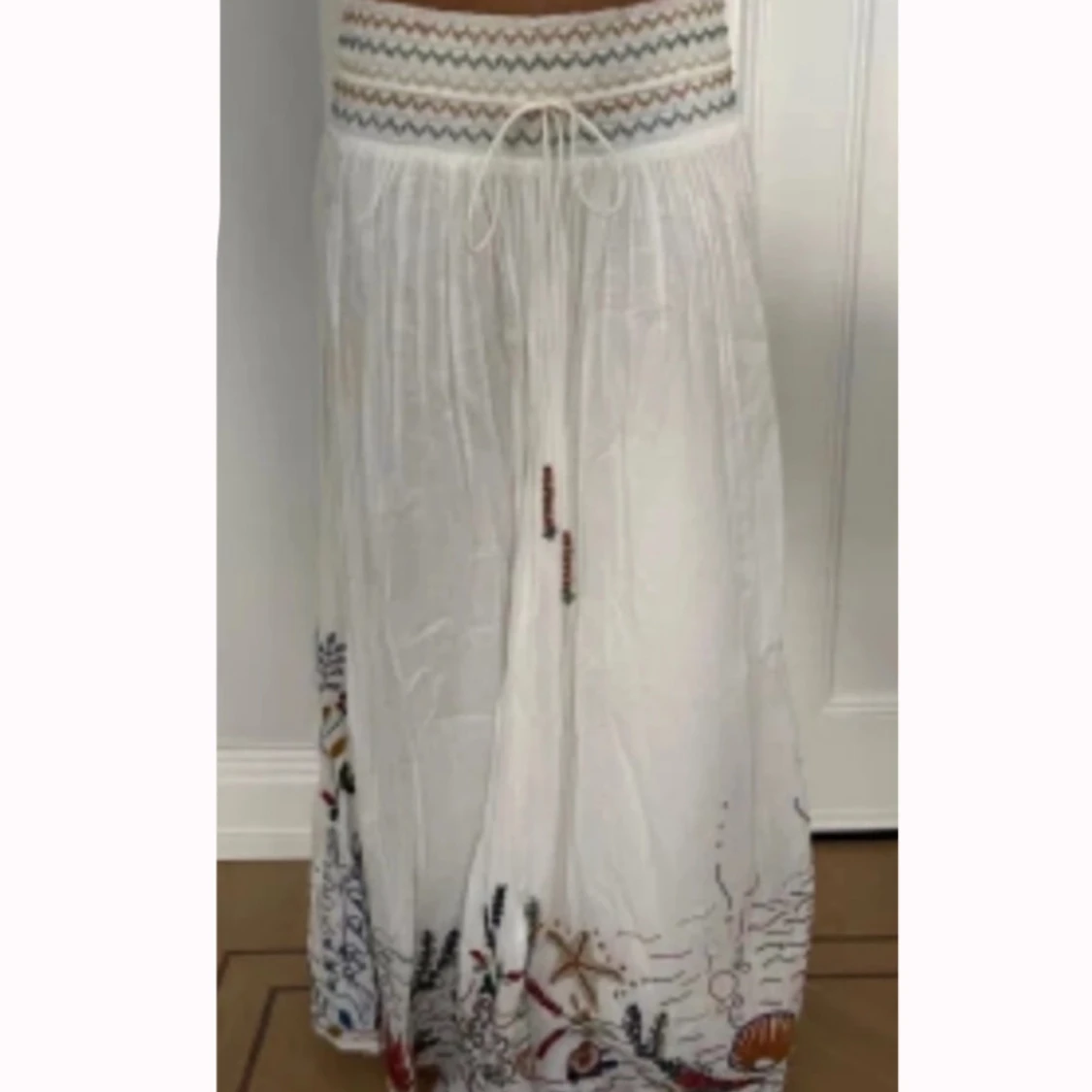 Superfin vit långkjol från Zara med färgglada broderade detaljer nertill och vågig mönsterkant i midjan. Kjolen har knytband i midjan och ett luftigt, flowy tyg som passar perfekt till varmare dagar.