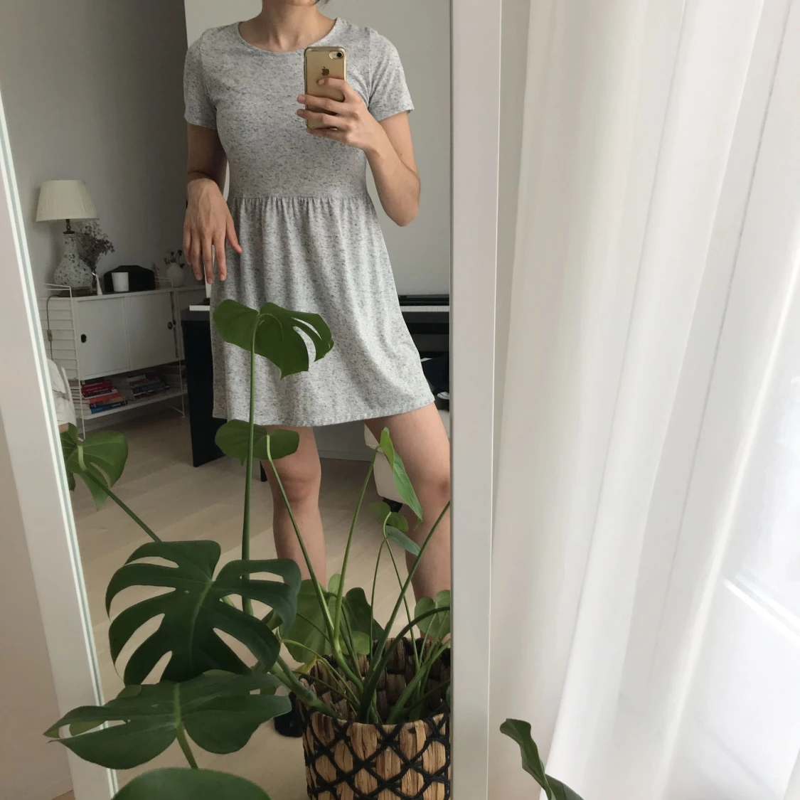 Grå, kortärmad klänning med mörkare prickar. Superskönt material och luftig sommarklänning. Knappt använd. Frakt ingår i priset.