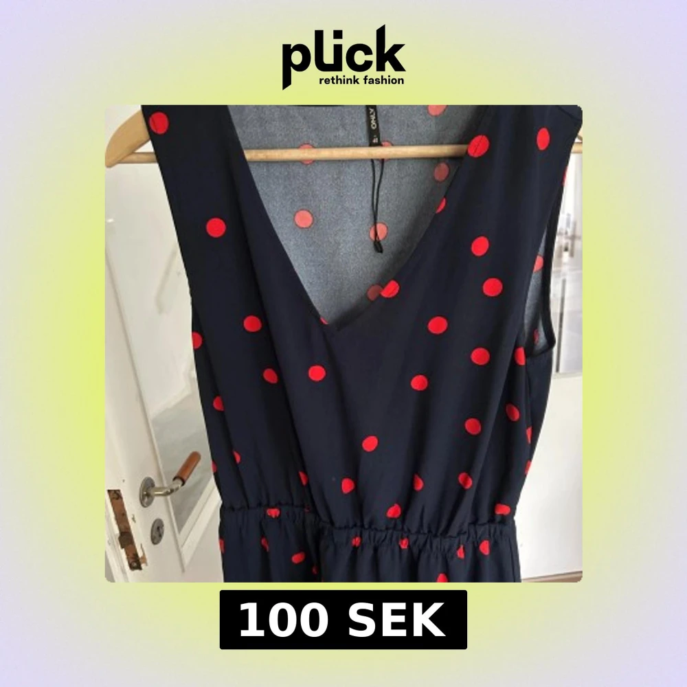 Säljer en mörkblå ärmlös klänning från Only med röda prickar och v-ringning. Klänningen har resår i midjan och en lätt utställd kjol. Perfekt för dig som gillar retrostil och vill ha något bekvämt och snyggt.