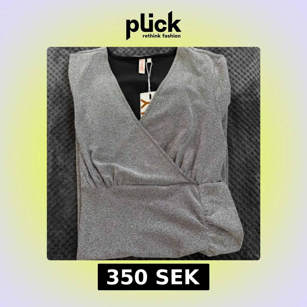 Snygg glittrig omlottklänning från Only i en elegant silverfärg. Klänningen har långa ärmar och en v-ringad design med volangdetaljer. Aldrig använd, har prislapp kvar. Storlek L.