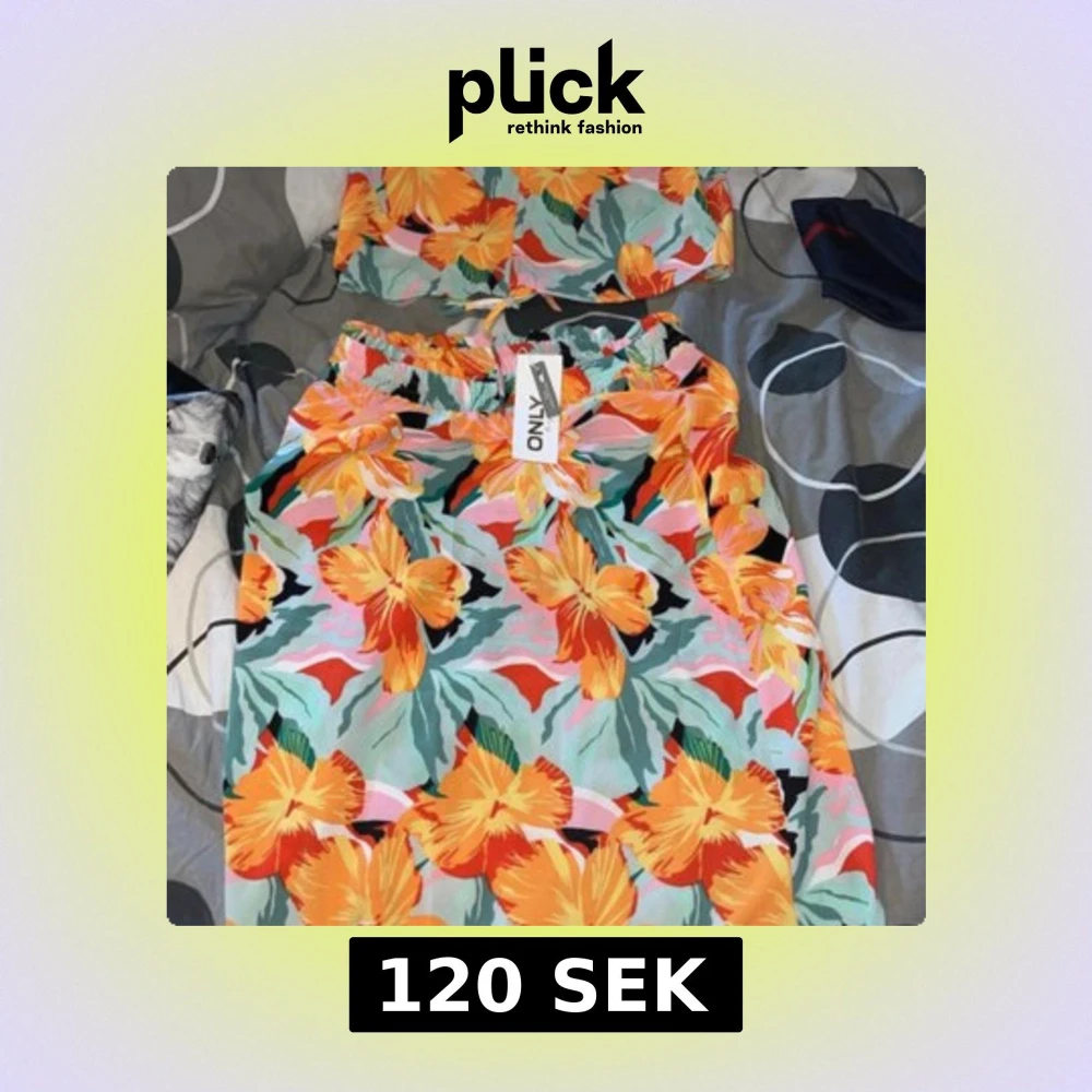Säljer ett färgglatt set från ONLY med stort blommigt mönster i orange, gul, grön och röd på ljus botten. Shortsen har elastisk midja med snörning och är perfekta för sommarens varma dagar. Materialet är mjukt och lätt, troligtvis bomull eller polyester.