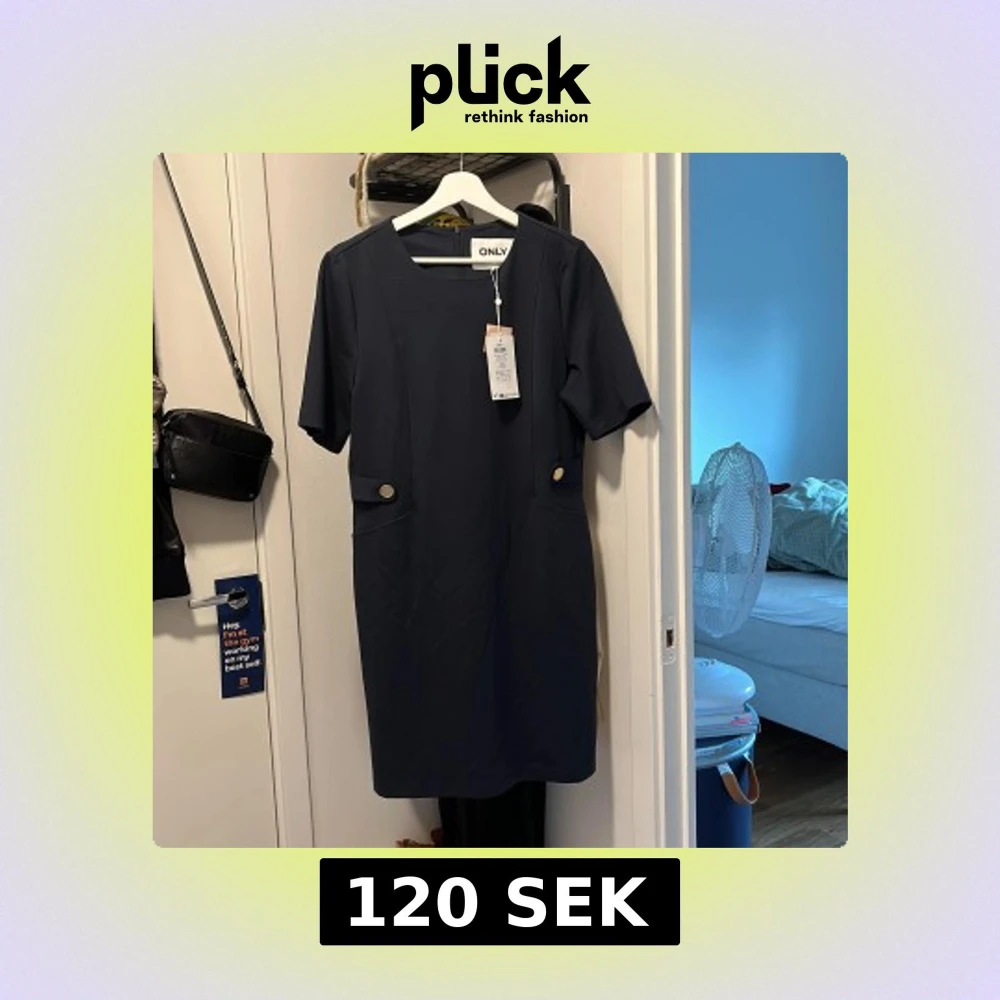 Marinblå klänning från Only med gulddetaljer. Helt ny med lappen kvar! Storlek 40