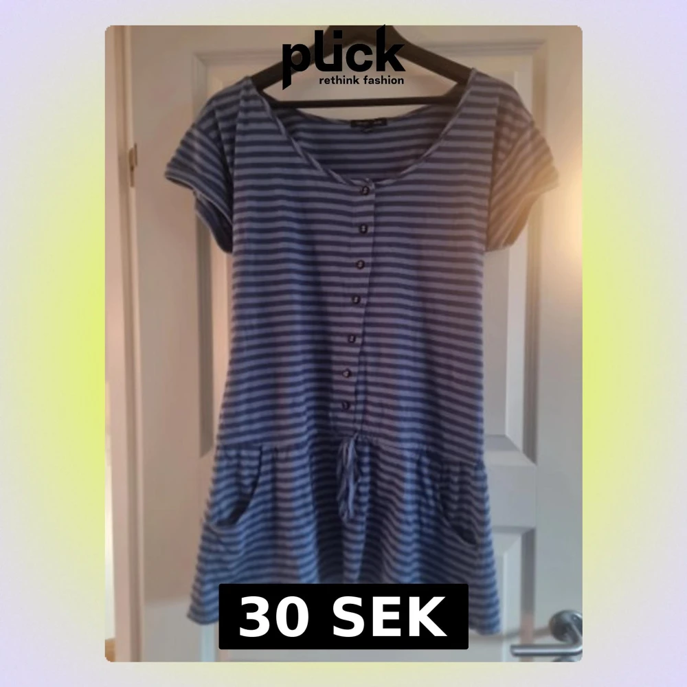 Säljer en blå och grå randig kortklänning från Only med knappar framtill, fickor och knyt i midjan. Klänningen har korta ärmar och är gjord i mjuk bomull, perfekt för en chill och avslappnad stil.