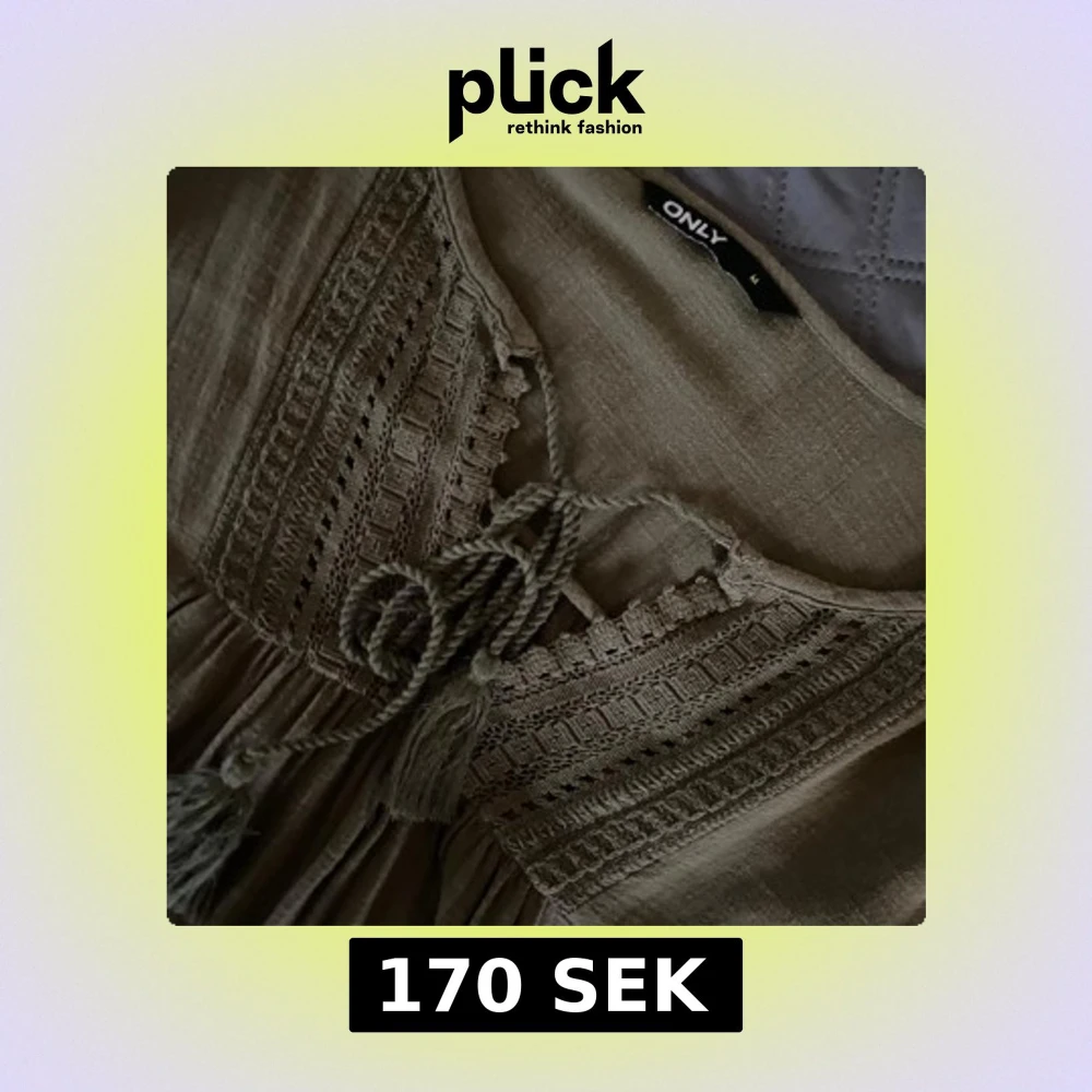 Säljer en grön långklänning från ONLY i boho-stil. Klänningen har långa ärmar, snygga virkade detaljer upptill och snörning med tofsar vid halsen. Luftig och skön modell som passar perfekt till varmare dagar.