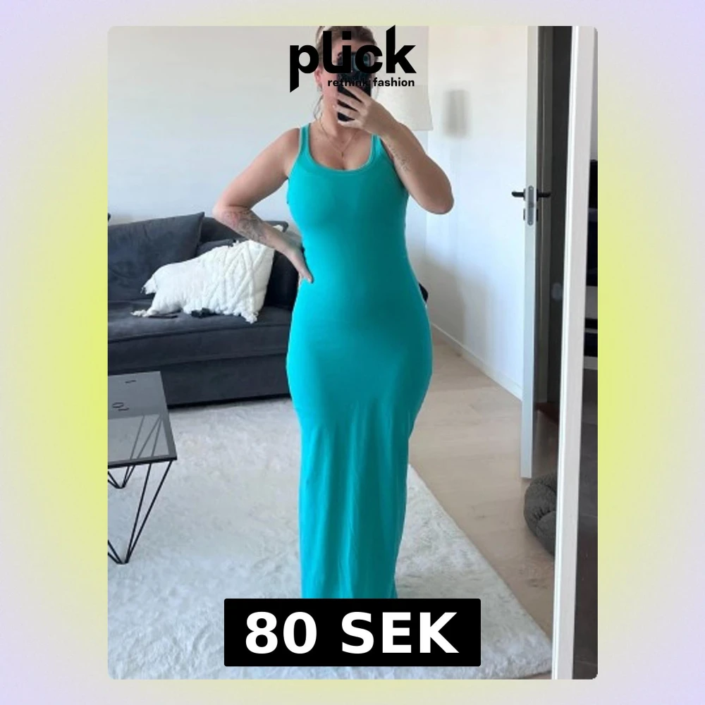 Säljer en turkos långklänning med smala axelband och figurnära passform. Klänningen är ärmlös och har en enkel, stilren design som passar perfekt till sommaren. Materialet känns mjukt och stretchigt, vilket gör den bekväm att bära hela dagen.