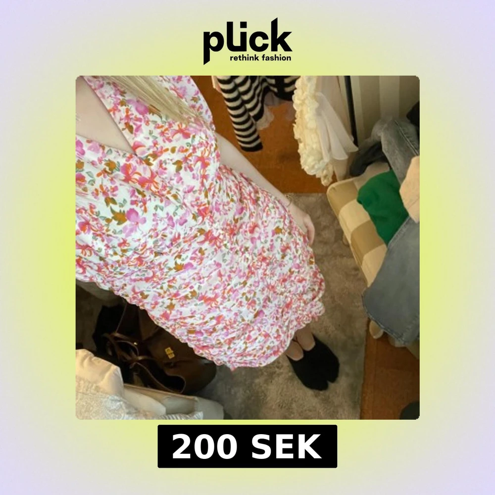 Säljer en söt kortklänning med blommigt mönster i rosa, orange och grönt på vit botten. Klänningen har v-ringning, korta ärmar och volangdetaljer längs kjolen. Perfekt för sommarens tillfällen!