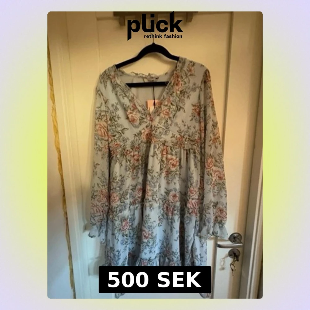 Supersöt kortklänning från ONLY i ljusblått med blommigt mönster i rosa och grönt. Klänningen har v-ringning, volangdetaljer och långa ärmar. Perfekt för sommarens alla tillfällen! Den har inte kommit till användning då ni ser att prislappen sitter kvar, köpte den förra sommaren men jag tyckte inte jag passade i den.