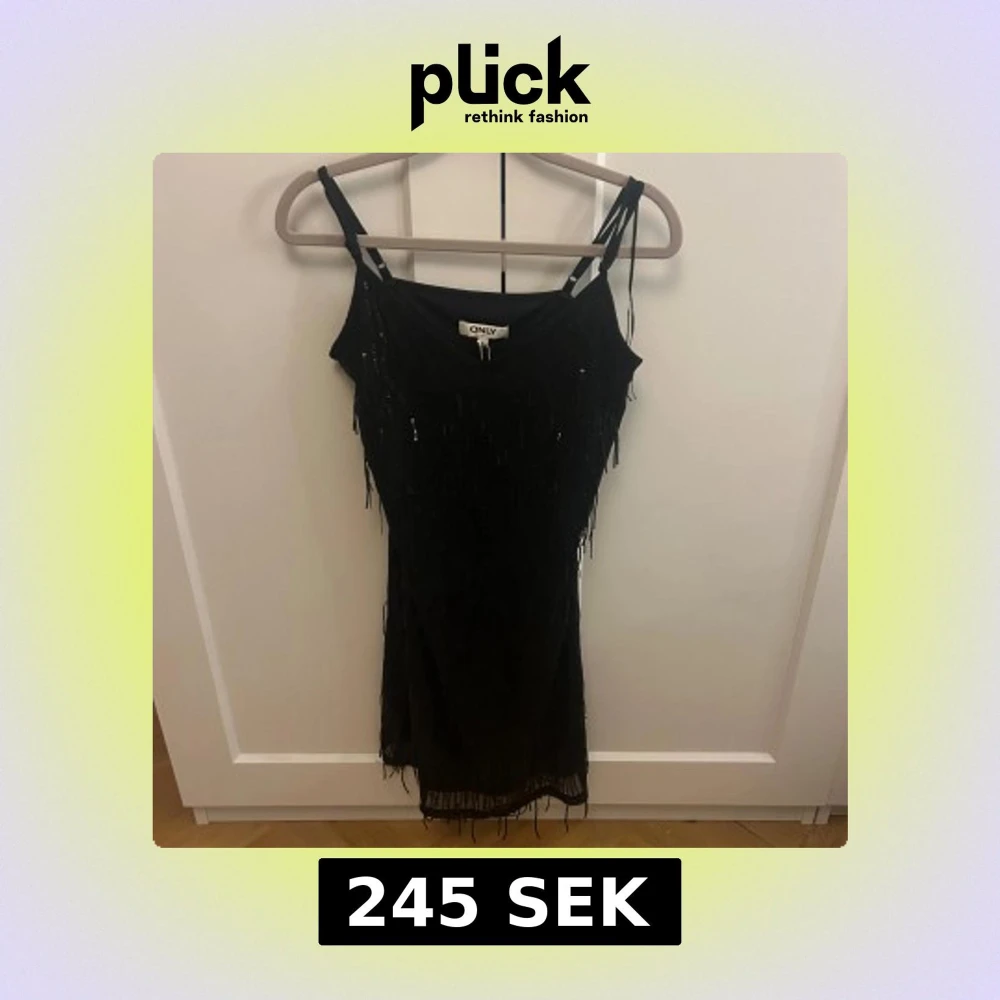 Supersnygg svart kort klänning från ONLY med smala axelband och glittriga paljettdetaljer. Kort i modellen! Helt ny 🩷