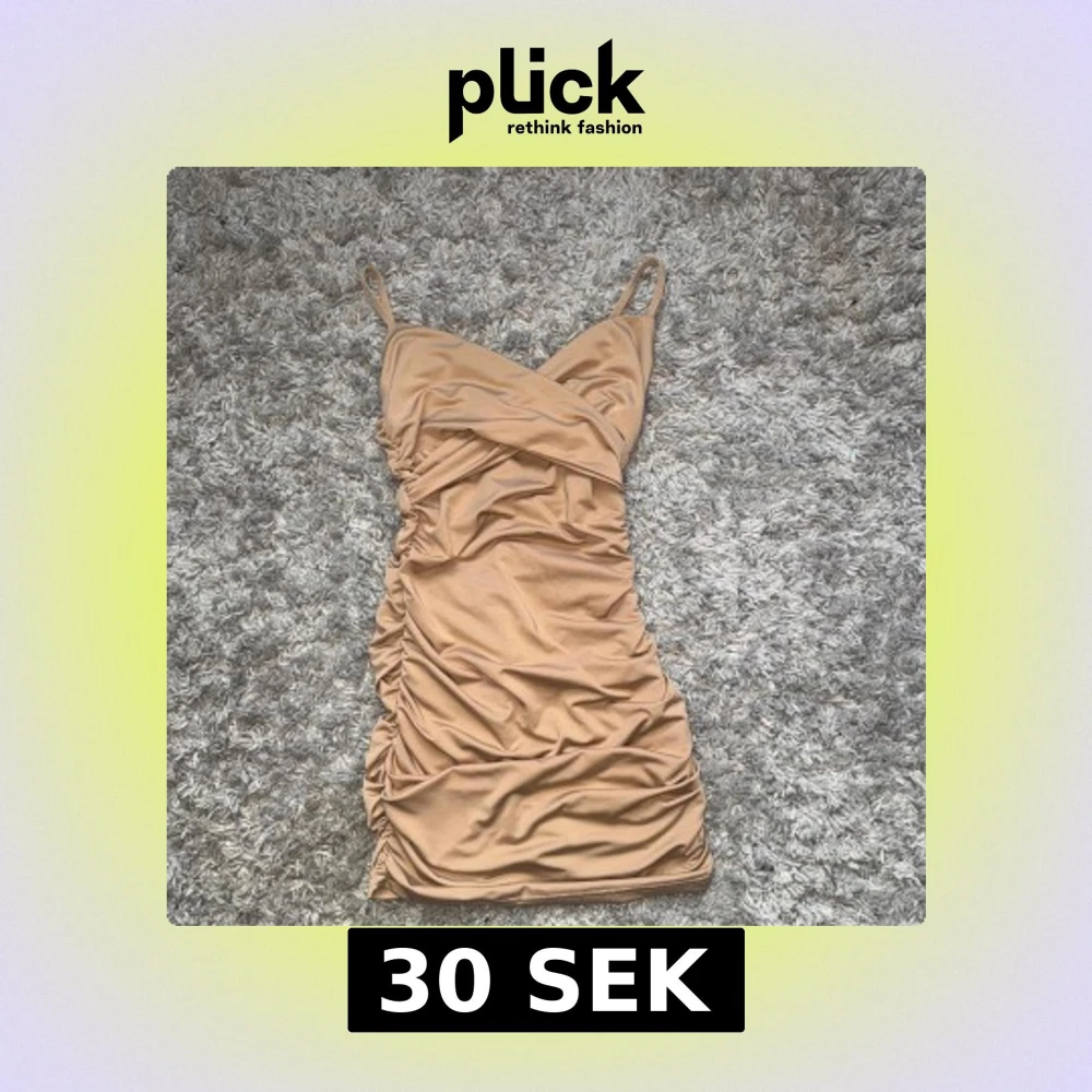 Supersnygg beige kortklänning med omlott-detalj och smala axelband. Klänningen har rynk längs sidorna och framtill, vilket ger en riktigt trendig och smickrande passform. Perfekt för dig som gillar en stilren men ändå iögonfallande look.