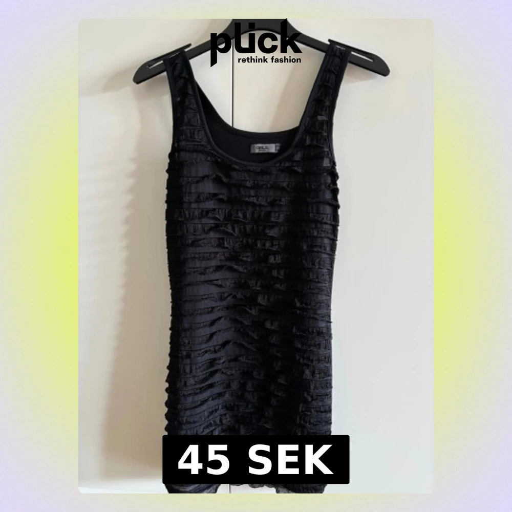 Säljer en svart kort klänning från Only med volangdetaljer på klänningen. Ärmlös modell med rundad halsringning och figurnära passform. Perfekt för dig som gillar en enkel men ändå unik look.