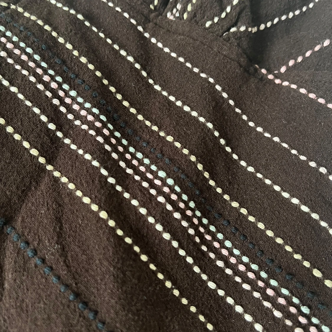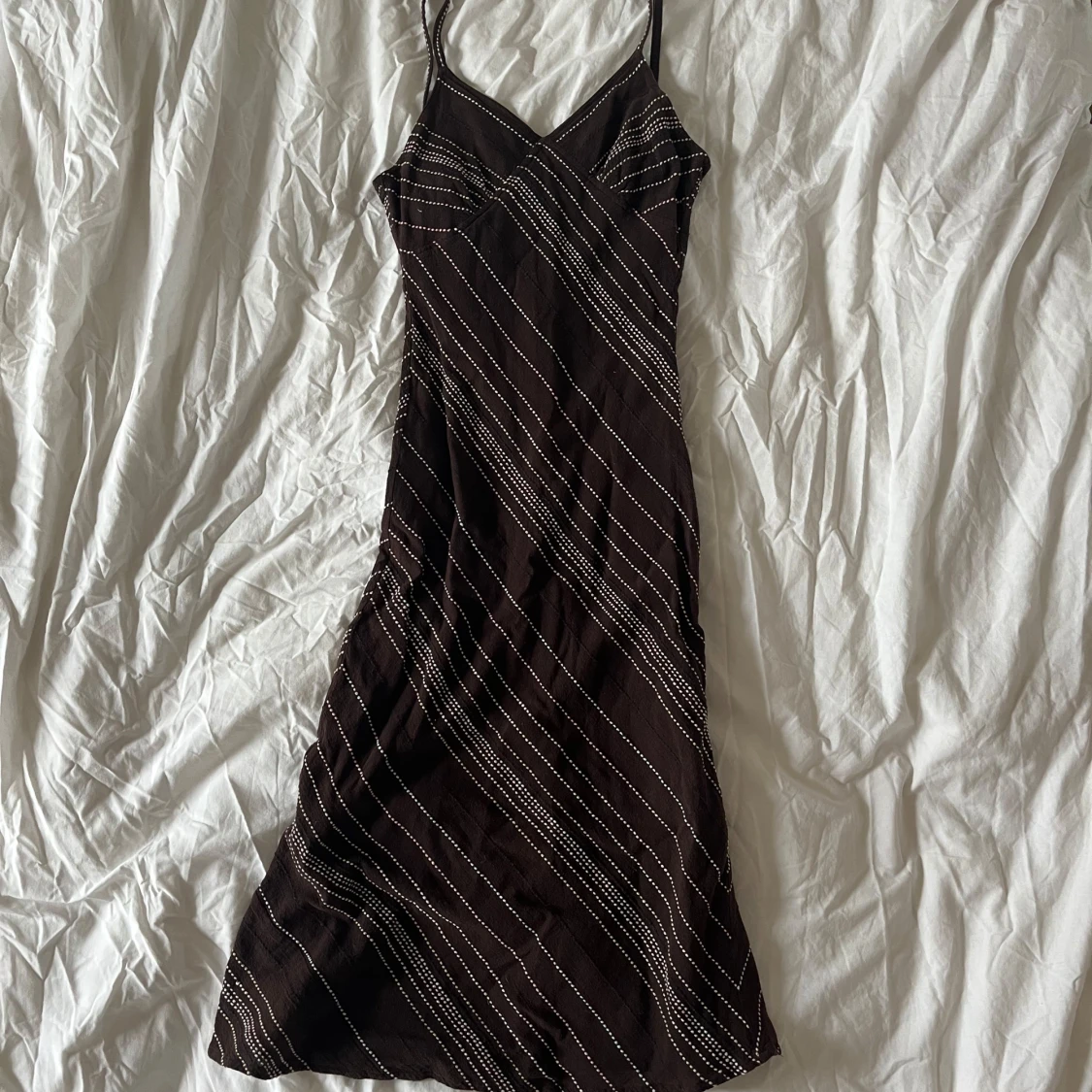 Snygg brun klänning med tunna axelband och diagonala ränder i olika färger. Står storlek 40 men liten i storleken, passar XS-S