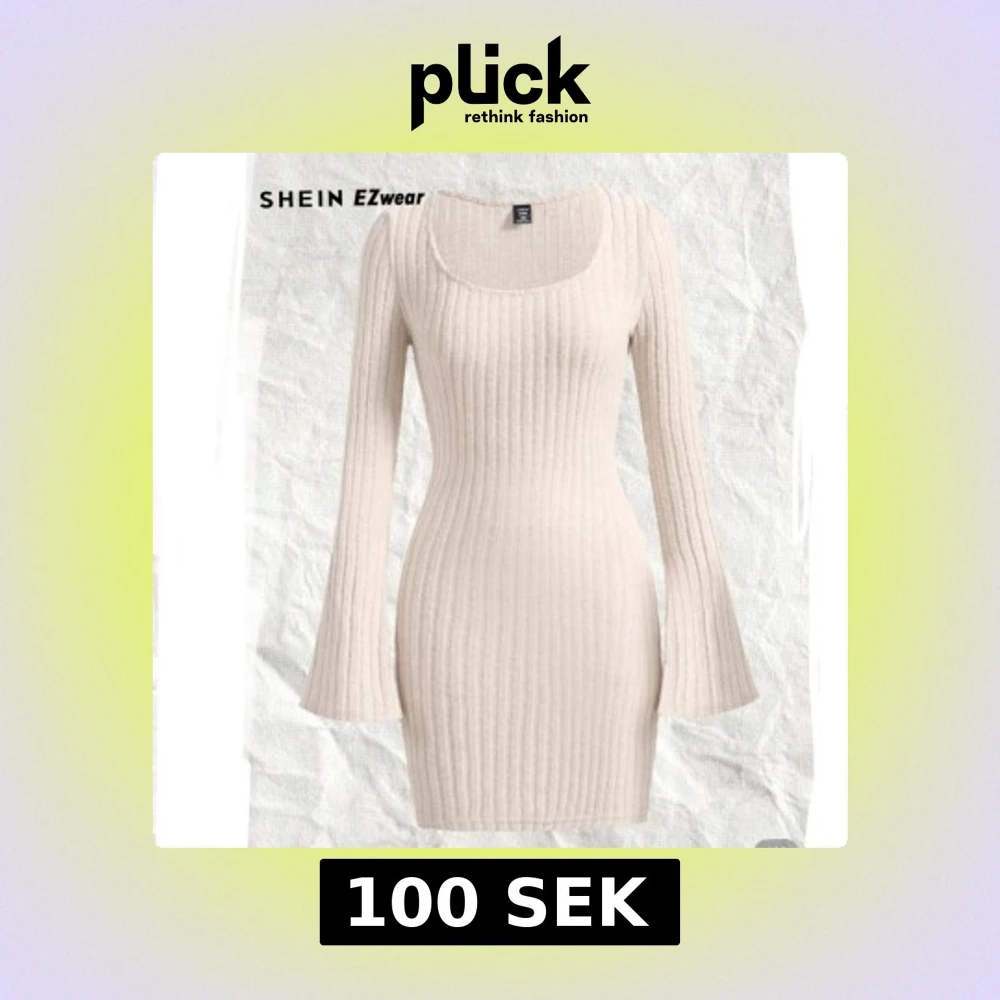 Snygg ribbad klänning från SHEIN Curve i beige . Klänningen har långärmade trumpetärmar och en rundad, djup ringning. Materialet är mjukt.Är aldrig använd då den var lita tajt på mig.