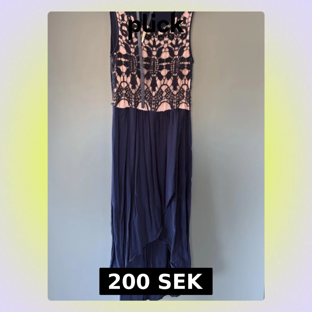 Snygg marinblå långklänning från Oasis med spetsdetaljer i svart och nude upptill. Tillhörde skärp. Klänningen har ärmlös design och ett flytande, asymmetriskt fall. Perfekt för dig som vill ha en unik och elegant look.