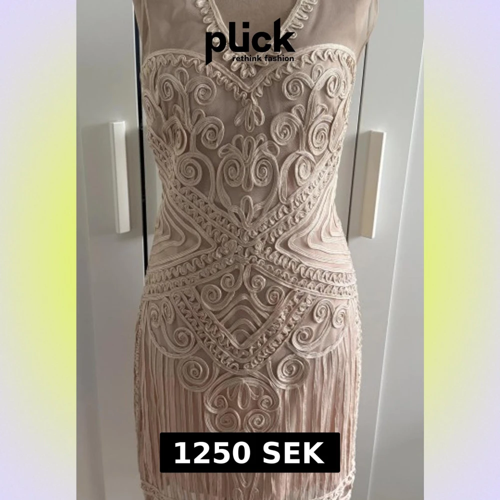 Supersnygg beige kort klänning från JS Collections med v-ringning och ärmlös design. Klänningen har detaljerad broderad spets och coola swirl-mönster över hela tyget. Materialet är tunt och känns lyxigt, perfekt för dig som gillar unika detaljer och elegant stil.