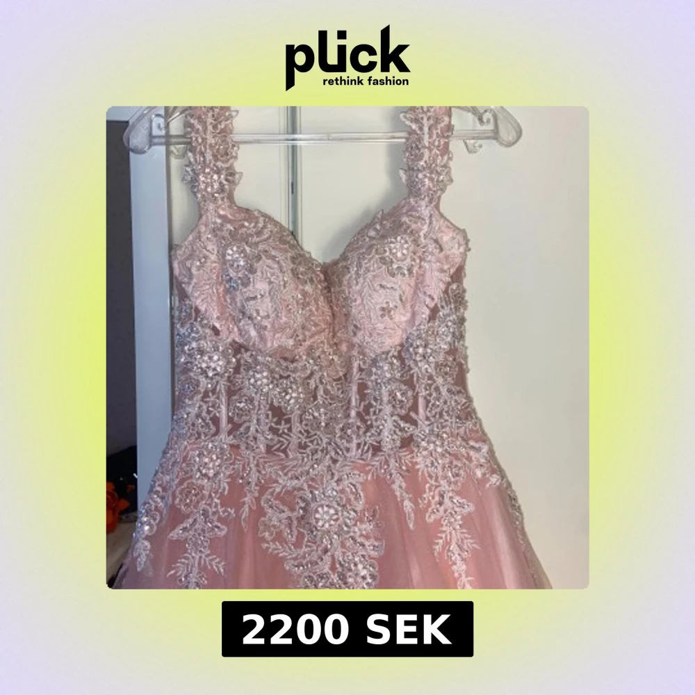 Drömmig rosa långklänning med vackra spetsdetaljer och glittrande paljetter över hela livet. Klänningen har breda axelband, markerad midja och en voluminös kjol i flera lager tyll. Perfekt för bal eller quinceañera. Snyggt blommönster och lyxig känsla. Har bara använts en gång.
