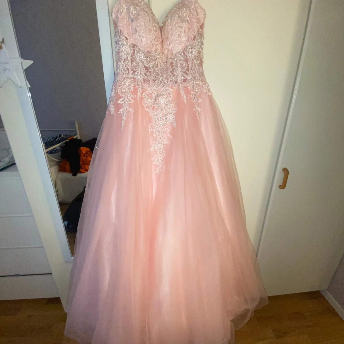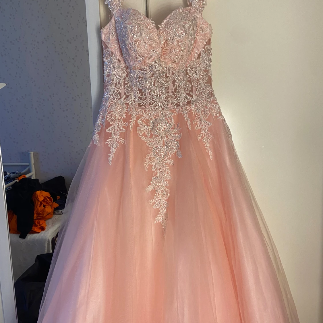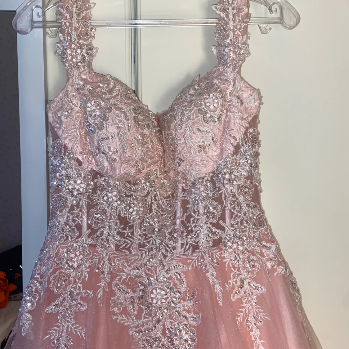 Drömmig rosa långklänning med vackra spetsdetaljer och glittrande paljetter över hela livet. Klänningen har breda axelband, markerad midja och en voluminös kjol i flera lager tyll. Perfekt för bal eller quinceañera. Snyggt blommönster och lyxig känsla.