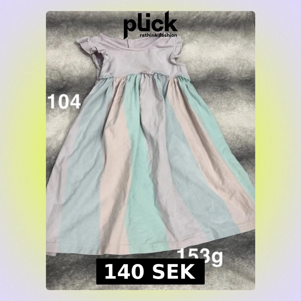 Supersöt klänning med breda pastellfärgade ränder i ljuslila, mintgrön och rosa. Ärmlös modell med små volangdetaljer vid axlarna och rund halsringning. Perfekt för varma dagar och enkel att matcha med sneakers eller sandaler.🌸 Fint använt skick. Storlek 104