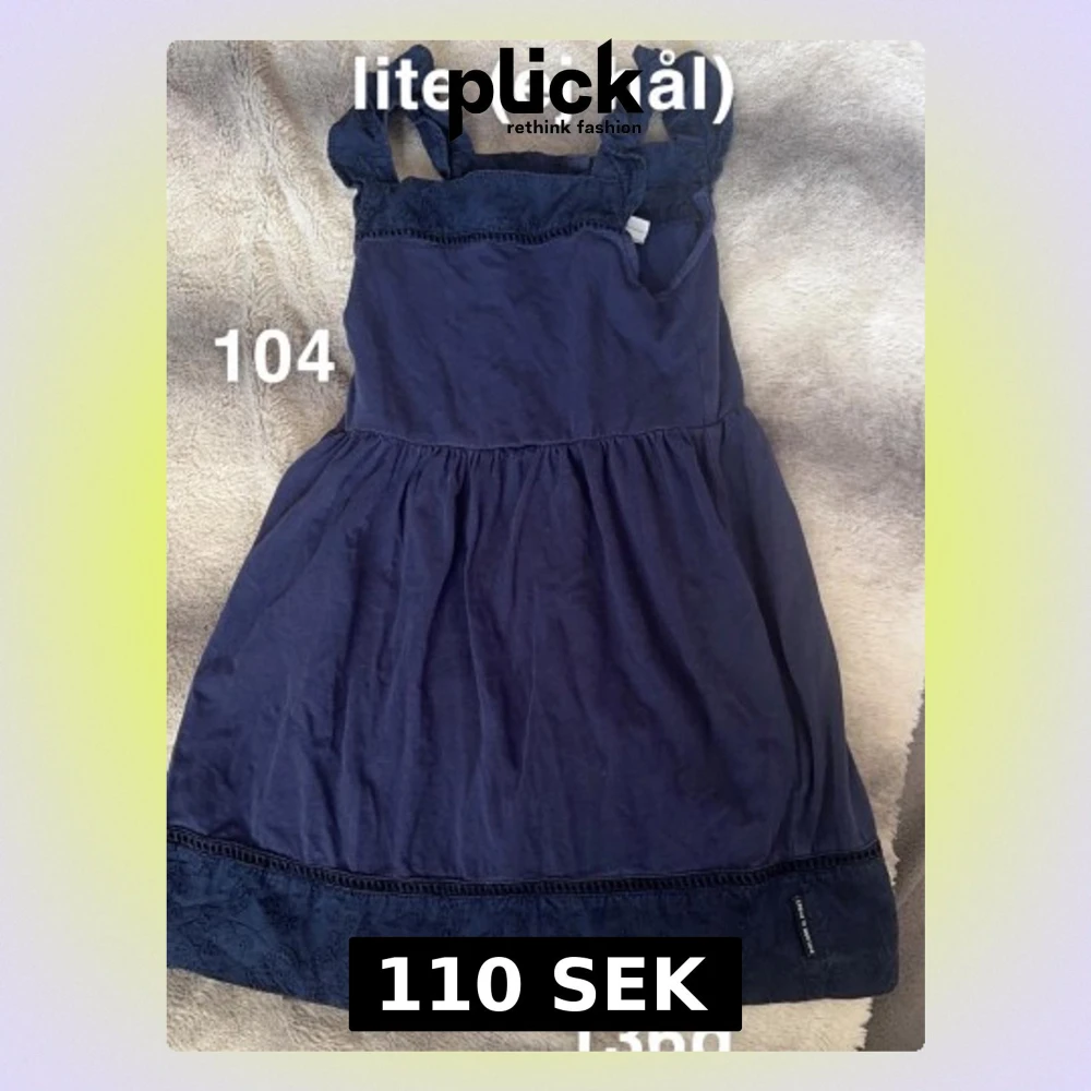 Söt mörkblå klänning med breda axelband och fina spetsdetaljer upptill och längst ner. Klänningen är ärmlös och har en lätt utställd kjol, perfekt för varma dagar.🌸 En söm har börjat släppa (ej hål) storlek 104