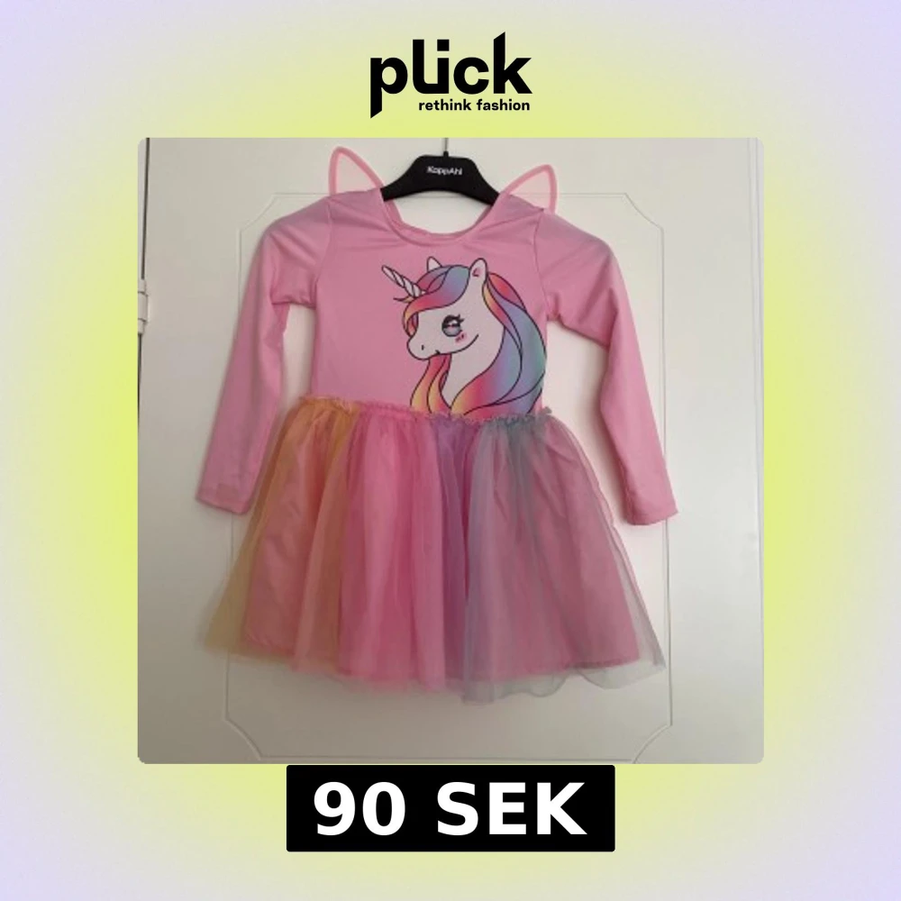 Superfin rosa klänning med lång ärm, enhörningstryck framtill och regnbågsfärgad tyllkjol. Klänningen har även fastsydda vingar på ryggen för extra magisk känsla. Perfekt för den som älskar enhörningar och färg!