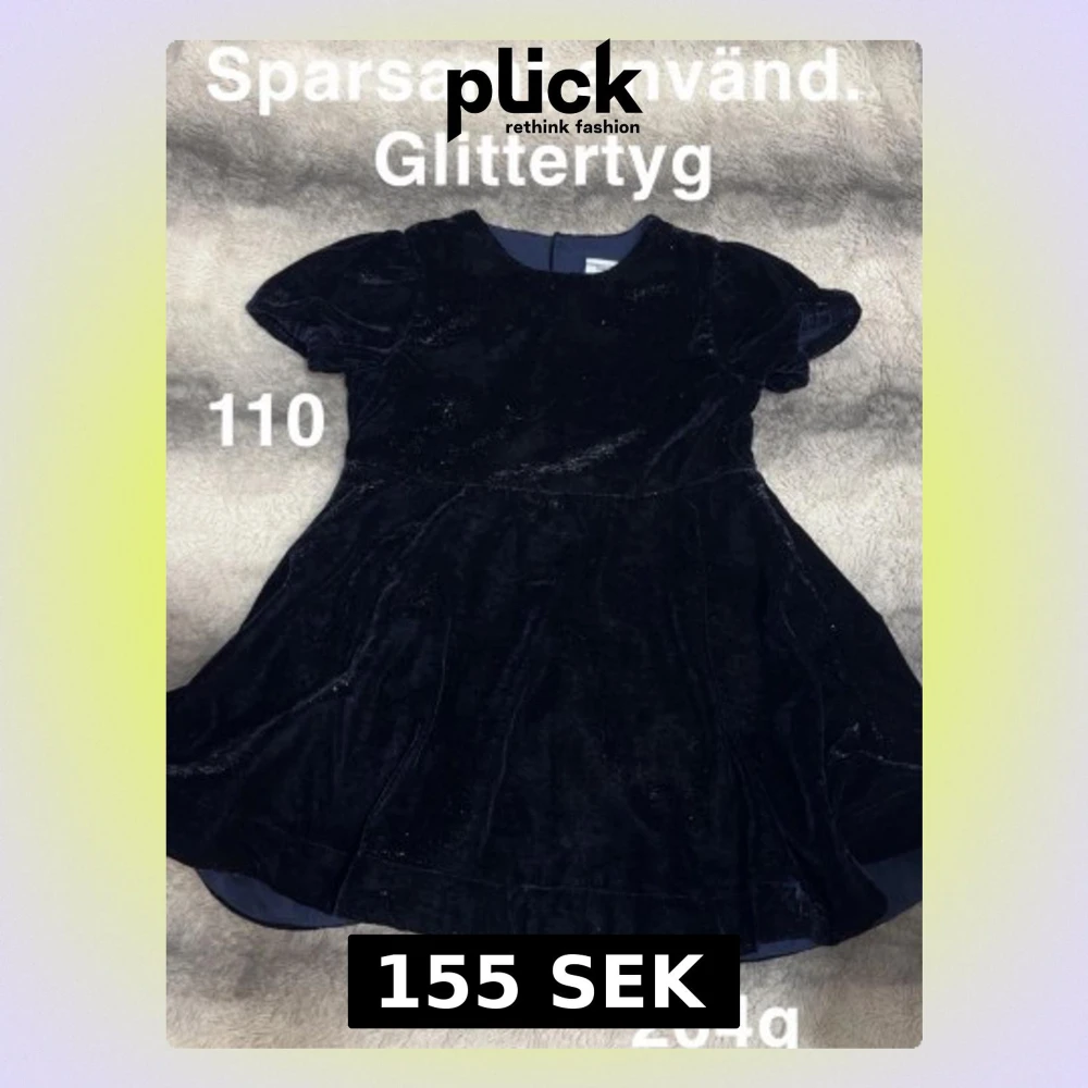 Söt mörkblå klänning i glittrigt tyg med korta puffärmar och rund hals. Kjolen har en lätt utställd form och tyget ger en lyxig känsla. Perfekt för speciella tillfällen när man vill glänsa lite extra.🌸 Sparsamt använd. Glittertyg. Storlek 110.