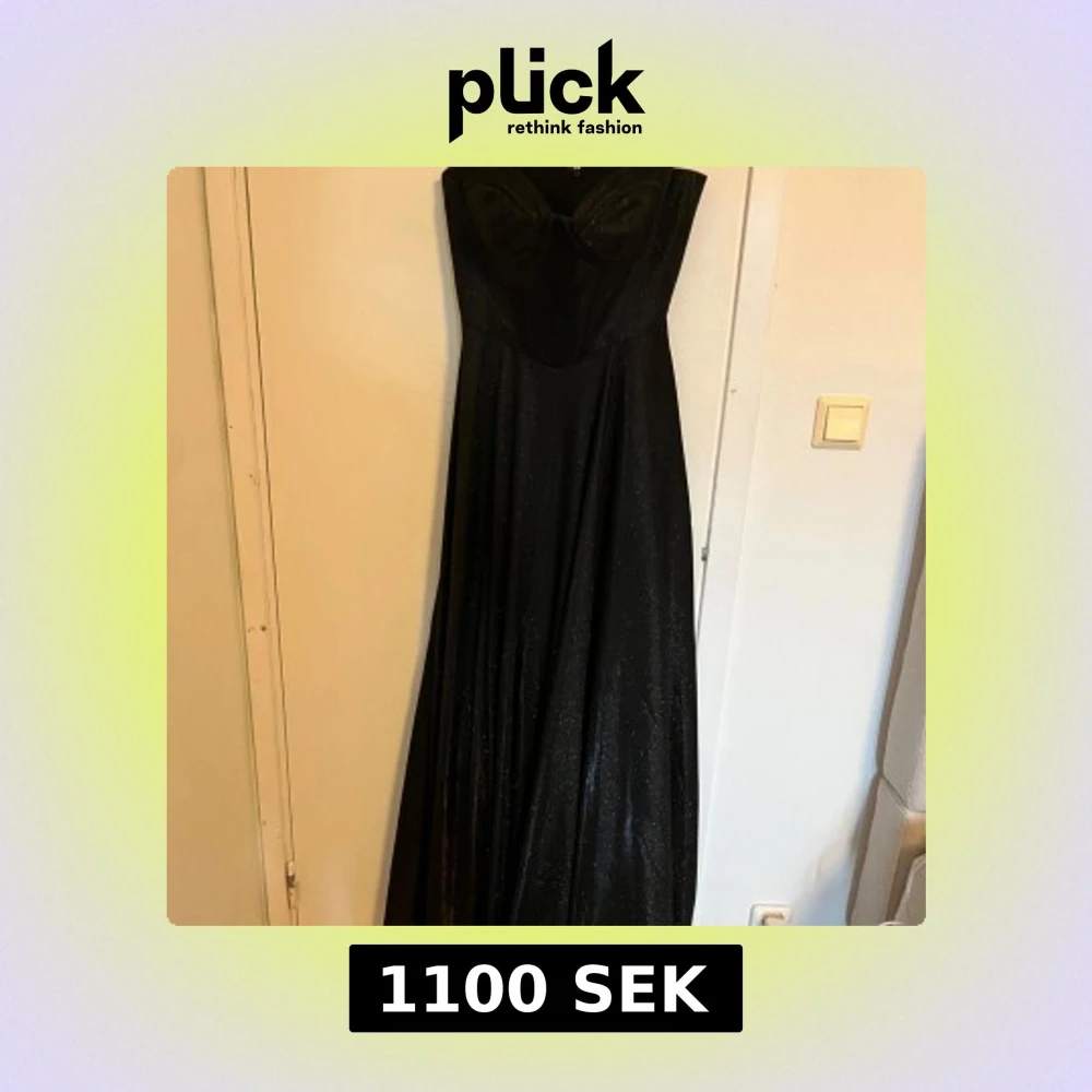 Supersnygg svart långklänning från Dressroom Linné med glittrigt tyg och markerad byst. modell med figurnära överdel och vidd i kjolen. Perfekt för dig som vill sticka ut med en elegant look.