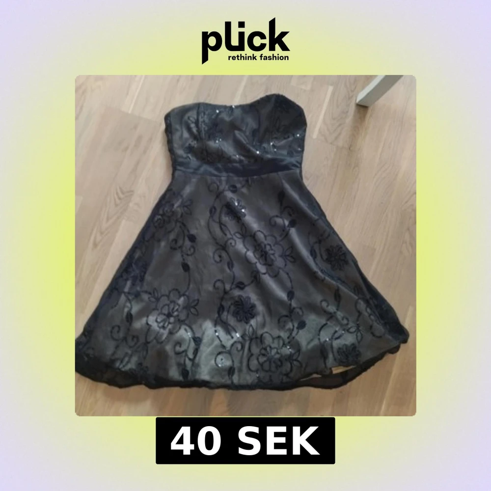 Snygg svart axelbandslös klänning från Miss Etam med blommigt broderi och paljettdetaljer. Perfekt för en festlig kväll! Klänningen har en elegant passform och en vacker glansig yta.