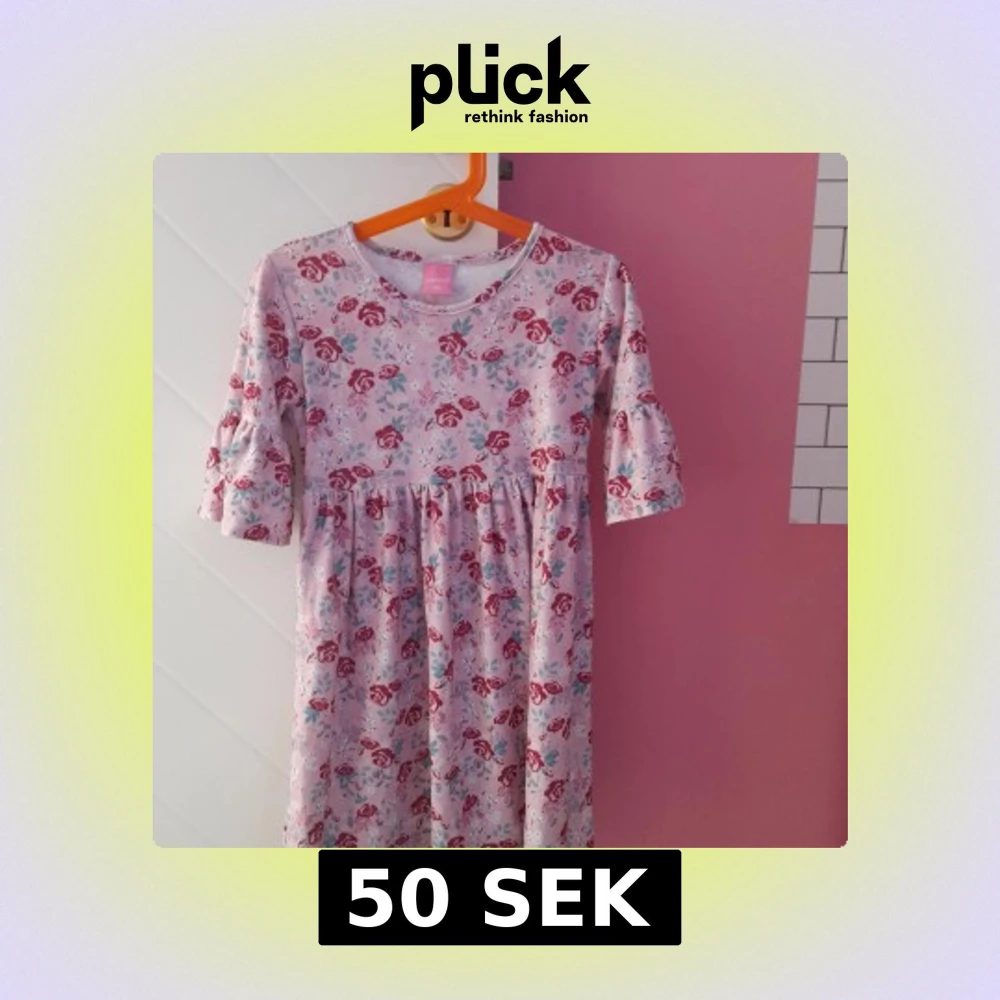Söt rosa klänning med blommigt mönster i rött och blått. Klänningen har rund halsringning och volangdetaljer på de halvlånga ärmarna. Perfekt för vår och sommar!