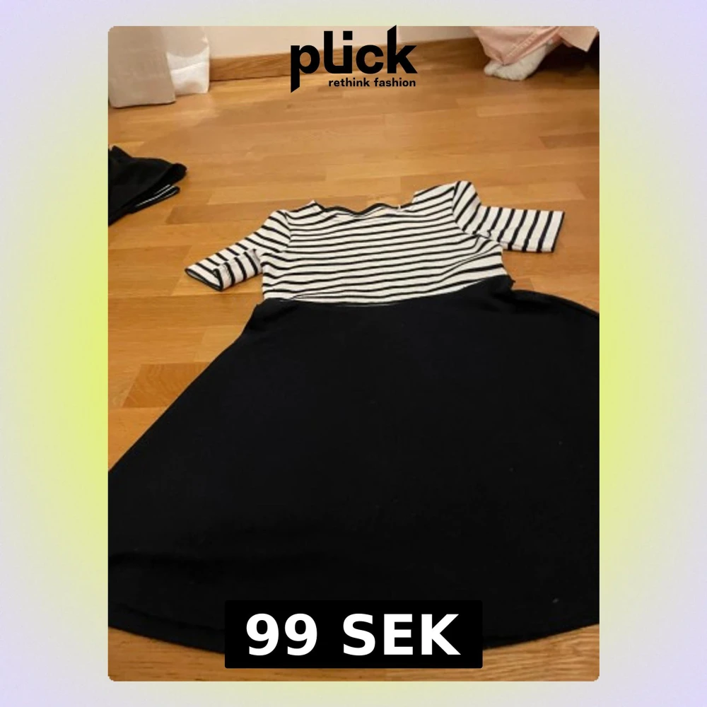Superfin klänning från Holly & Whyte by Lindex i storlek 128. Överdelen är vit med svarta ränder och har trekvartsärm, medan kjolen är helsvart och utsvängd. Tillverkad i mjuk bomull som är skön att ha på sig hela dagen.
