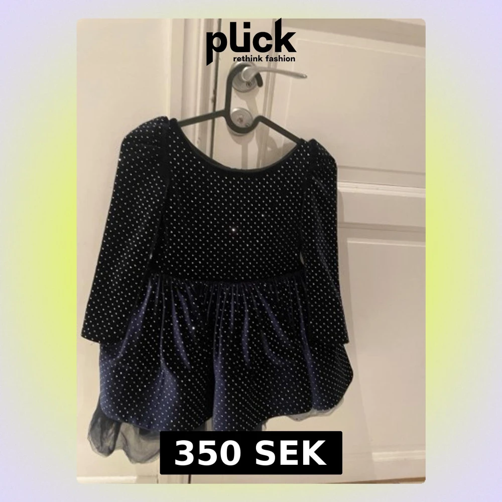Supersöt mörkblå sammetsklänning med vita prickar och stor rosett bak. Klänningen har lång ärm, puffiga axlar och volangkant nertill. Perfekt för dig som vill sticka ut lite extra! Strl 128